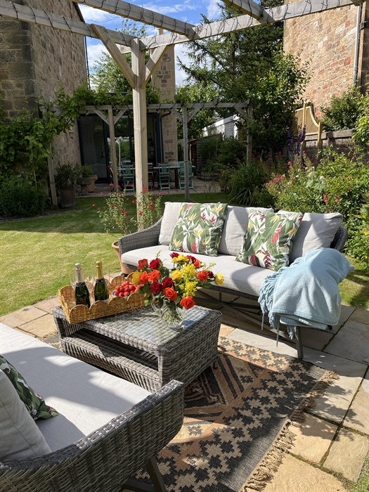 Private garden with terrace to set up the Big Green Egg BBQ and fire pit to toast marshmallows. Space for children to play games and the swaying hammock is great whilst sofa seating under the pergola catches the evening sun.