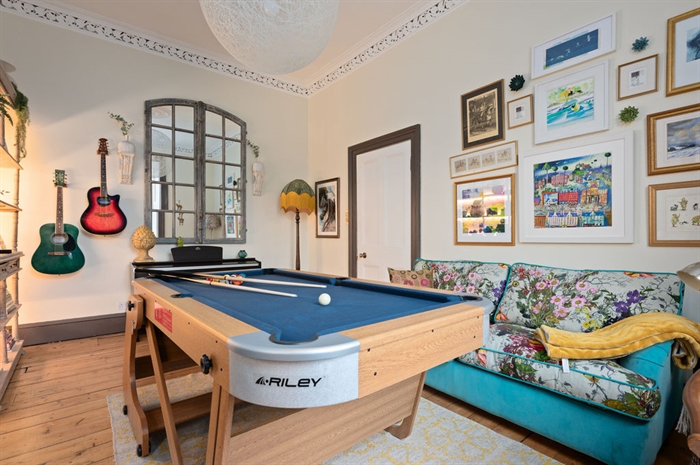 Games room with multiplay pool, table tennis or darts. Shelves stocked with books and drawers with fun card games galore.