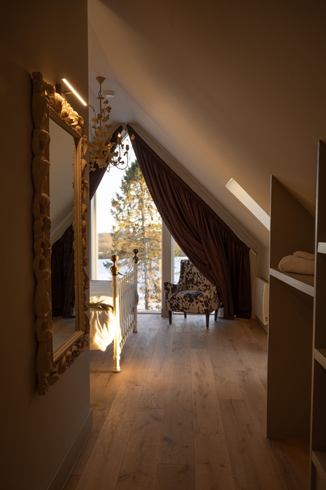 Downstairs, a spacious open-plan living room and a delightful mini-mezzanine kitchen/dining area, overlooking the living room, provide plenty of space to relax. The generously sized kitchen is fully equipped with all modern conveniences, including a built-in oven, microwave and smart butler sink, and the dining table seats six.