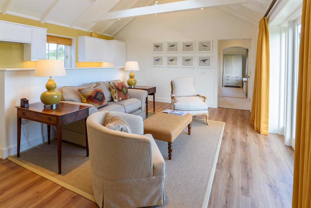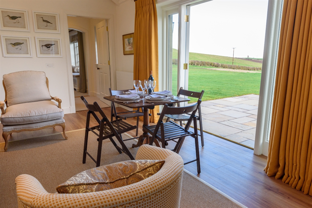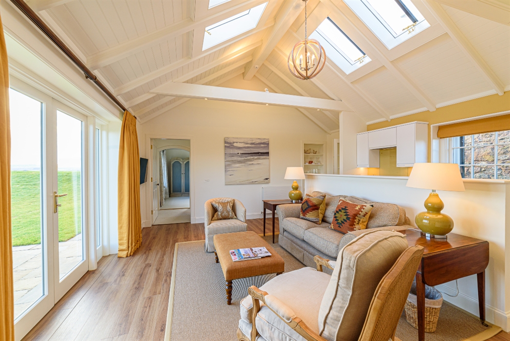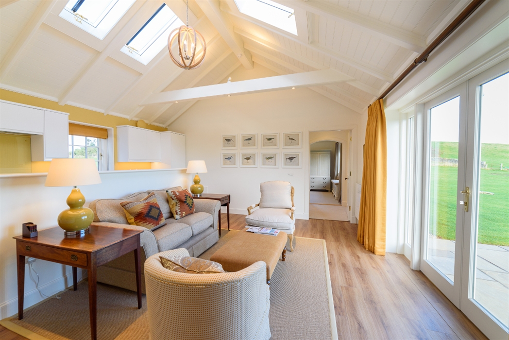 Sitting room – double sofa, two armchairs, Smart TV, Bose Bluetooth speaker. French doors lead out onto a patio area with outdoor furniture with superb views across open countryside.