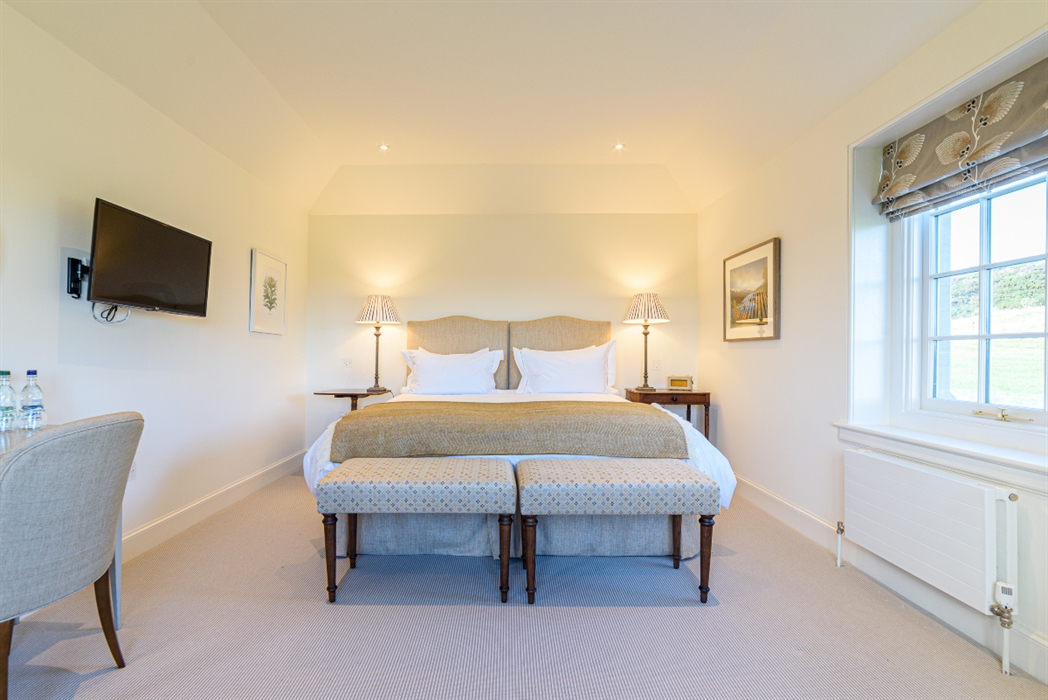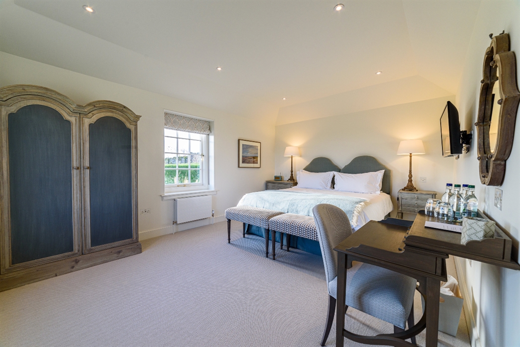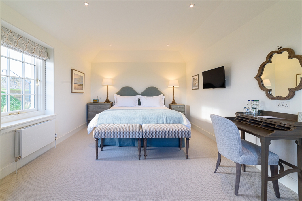 North bedroom with zip and link beds which can be configured as a super king double or twin, side tables, wardrobe, chest of drawers, window seat, dressing table, Roberts DAB radio and wall-mounted Smart TV.