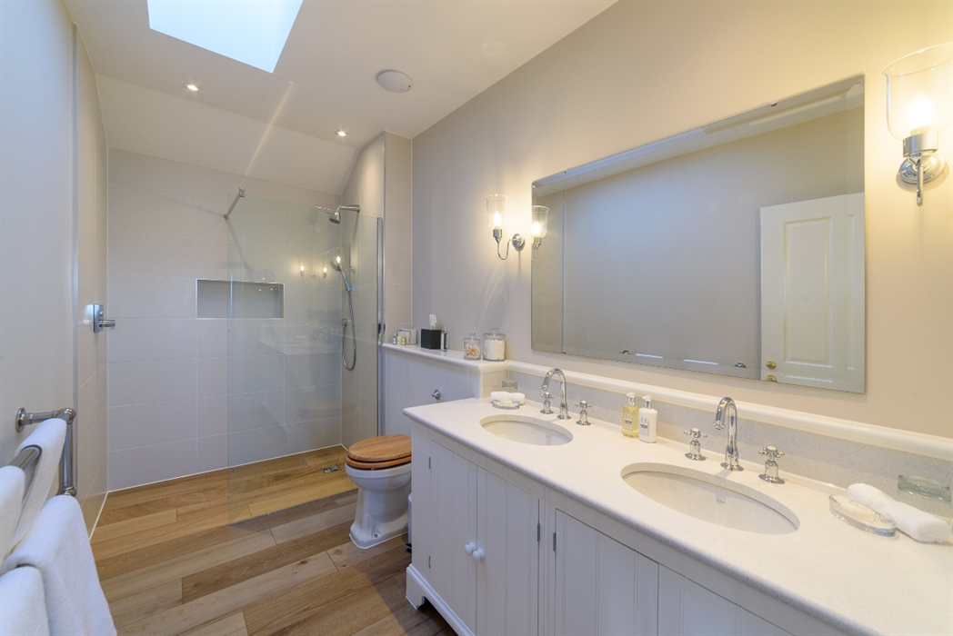 En suite shower room with large walk-in shower with separate mixer, twin basins, heated towel rail and WC.