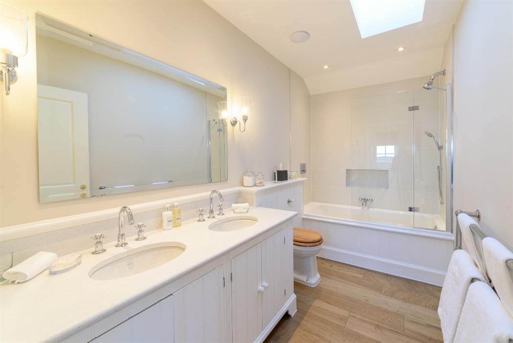 En suite bathroom with bath and shower over, twin basins, heated towel rail and WC.
