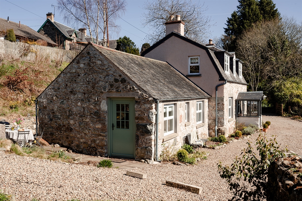 This beautifully renovated traditional cottage with wood burner and underfloor heating offers a stylish escape and views over the treetops near Glenshee in Highland Perthshire.