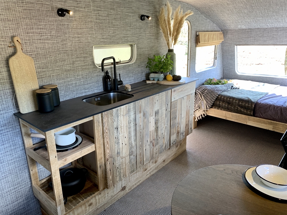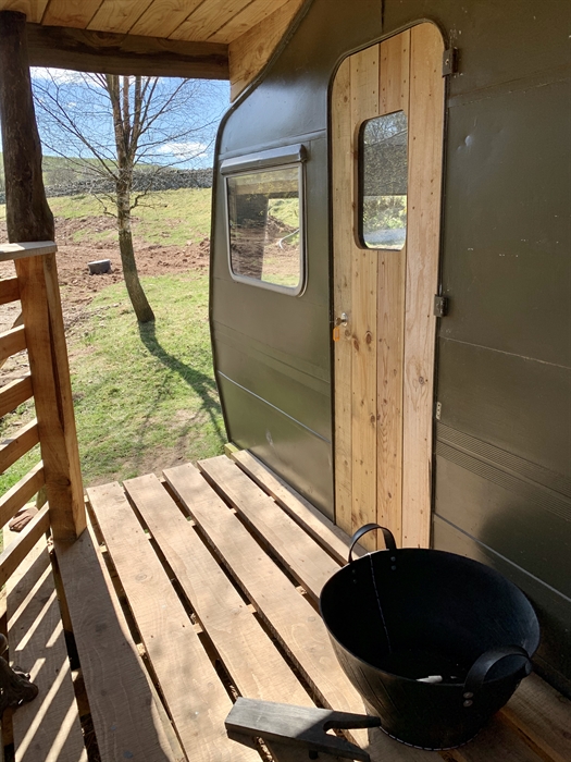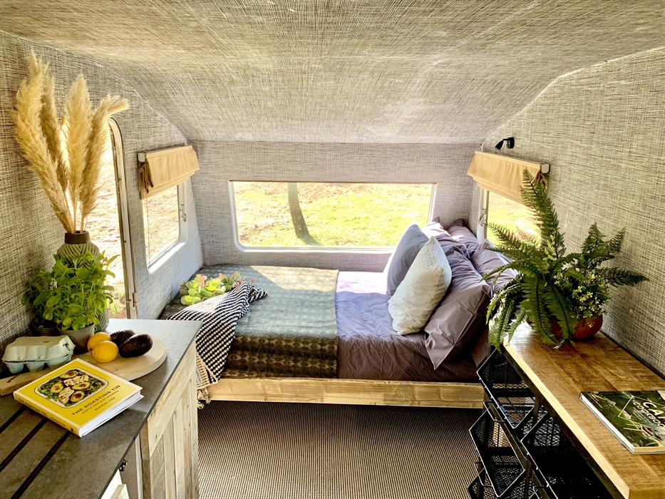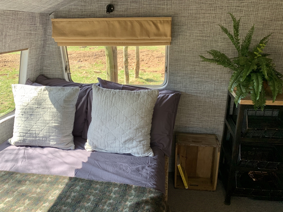 The cosy double bed has river views, a comfy mattress and extra blankets. It's the same size as the original bed in the vintage caravan (i.e. a small double). You’ll find plenty room underneath to store bags and belongings, as well as a chest of drawers for clothes. If you're a family group, you can make use of the extra single bed in the living area, and we can also provide a further blow-up bed. You can even bring a tent for older kids!