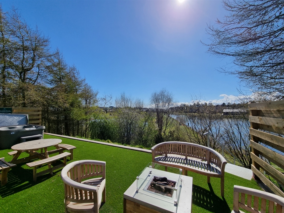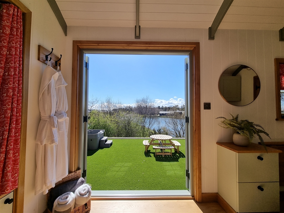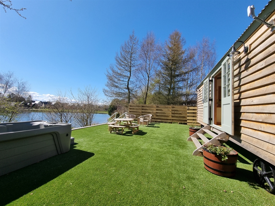 In Coorie Doon there’s a fully-fitted kitchen complete with an oak worktop, Butler sink, integrated fridge, combination microwave, induction hob and all the crockery and cutlery you’ll need. There’s more! Underfloor heating, a TV, a built-in bed and mattress, a chesterfield sofa, a fold-down oak table and two wooden chairs, plus, a bathroom with an Edwardian shower, heated towel rail and a toilet. The highlight is a private hot tub outside. When you step outside you are welcomed onto a secluded space with lush Astroturf, that leads to a gas firepit with oak benches, as well as a picnic bench with a pergola, where you can make the most of al fresco dining with waterside views.