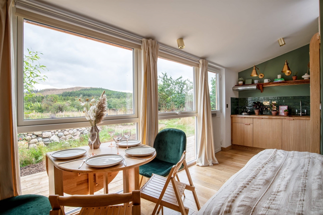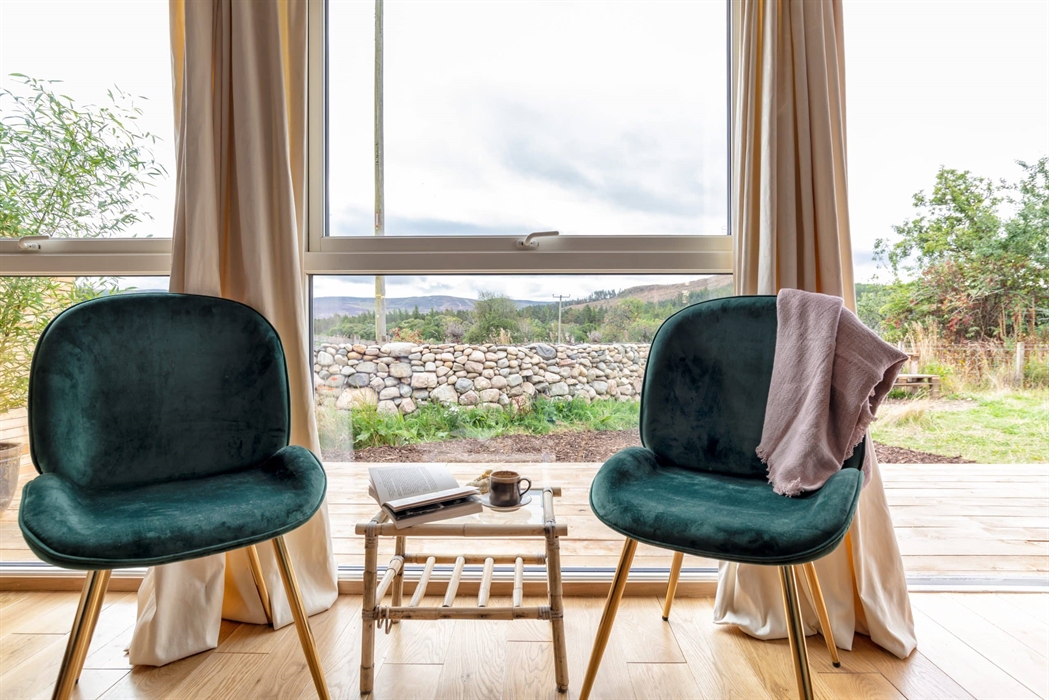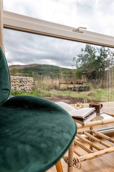 Immerse yourself in the serene beauty of the Cairngorms with a stay at our enchanting forest view cabin, where sustainability meets luxury in a compact design. Perfect for romantic getaways or family adventures, this cabin offers breathtaking forest and mountain vistas right from your bed through expansive windows. Whether you’re starting your day with the stunning scenery or ending it on the deck or in the shared hot tub with a glass of wine, this cabin promises unforgettable moments surrounded by nature. Designed to accommodate up to four guests, it features a king-sized bed on the ground floor and a double loft bed, accessible by ladder, perfect for kids or the young at heart. The cabin also boasts a small kitchen with modern amenities, including an air fryer, an outdoor dining area, and a spacious bathroom with an eco-friendly shower.
