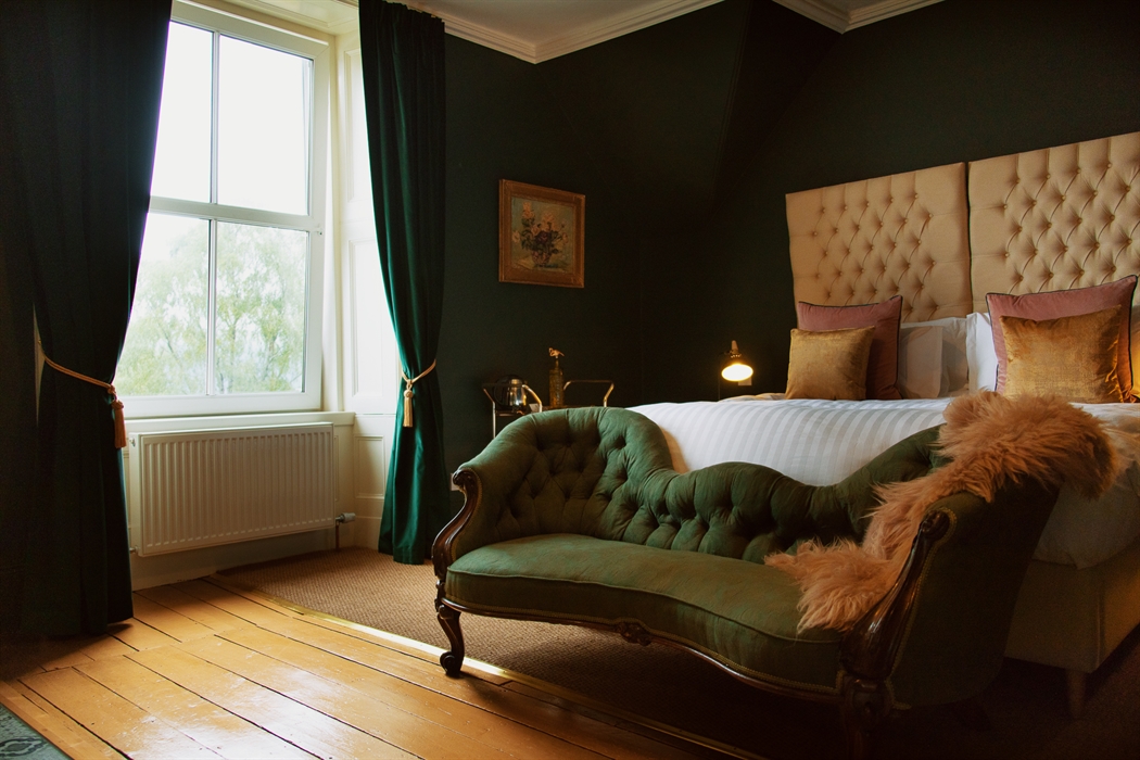 Our Executive Suite offers stylish accommodation with a bit more space - perfect for longer stays - and has its own entrance located at the rear of Foyers Lodge. The Executive Suite enjoys a spacious open plan living area which is furnished with luxurious Chesterfield seating as well as a variety of carefully selected antiques and artworks; including lighting reclaimed from the refurbishment of Aberdeen’s historic Music Hall. This stunning one-bedroom suite is perfect for couples seeking an indulgent and romantic hideaway. Minimum 2 night stay with breakfast included, make a reservation via the 'book your stay' button at foyerslodge.co.uk
