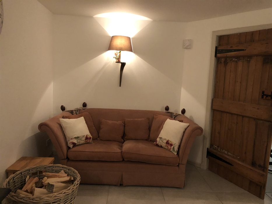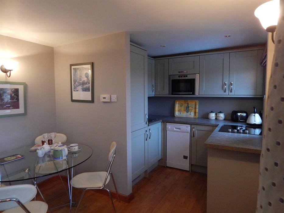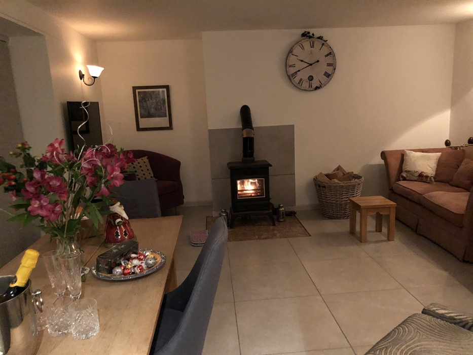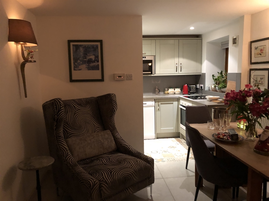Garden Bank Cottage is on ground level with contemporary open plan living room with a small kitchen / dining area, wood burning stove and French - windows out to the decked garden.