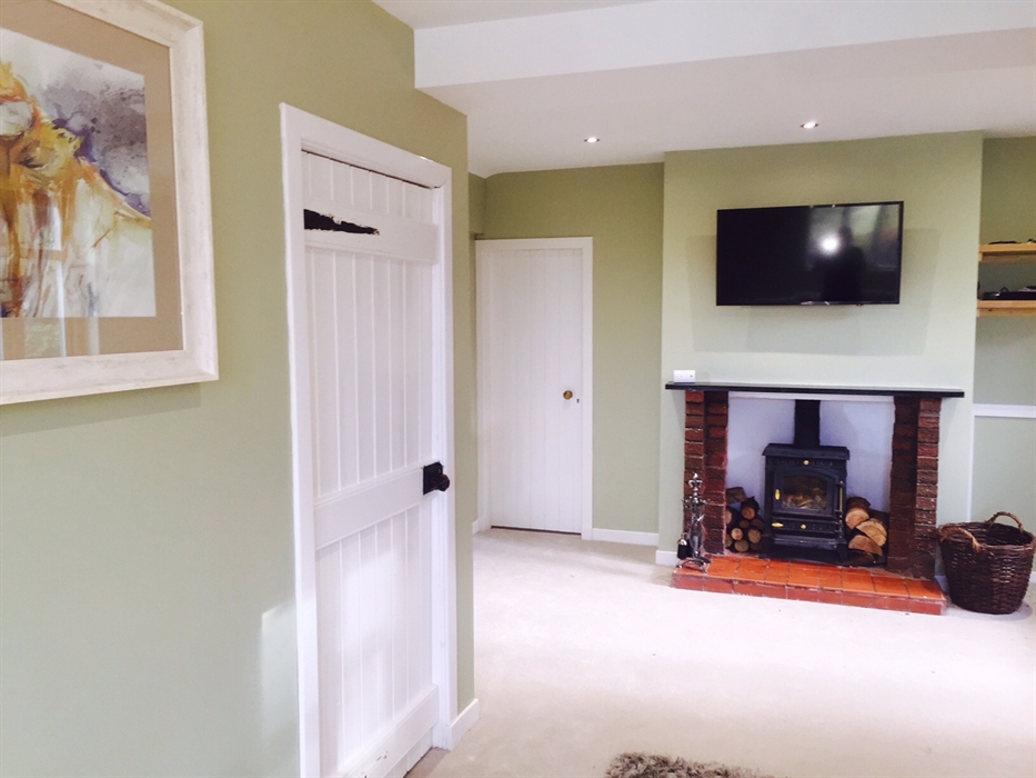 - Living Room - Large sitting room with a wood burning stove, wall mounted TV and sound system.