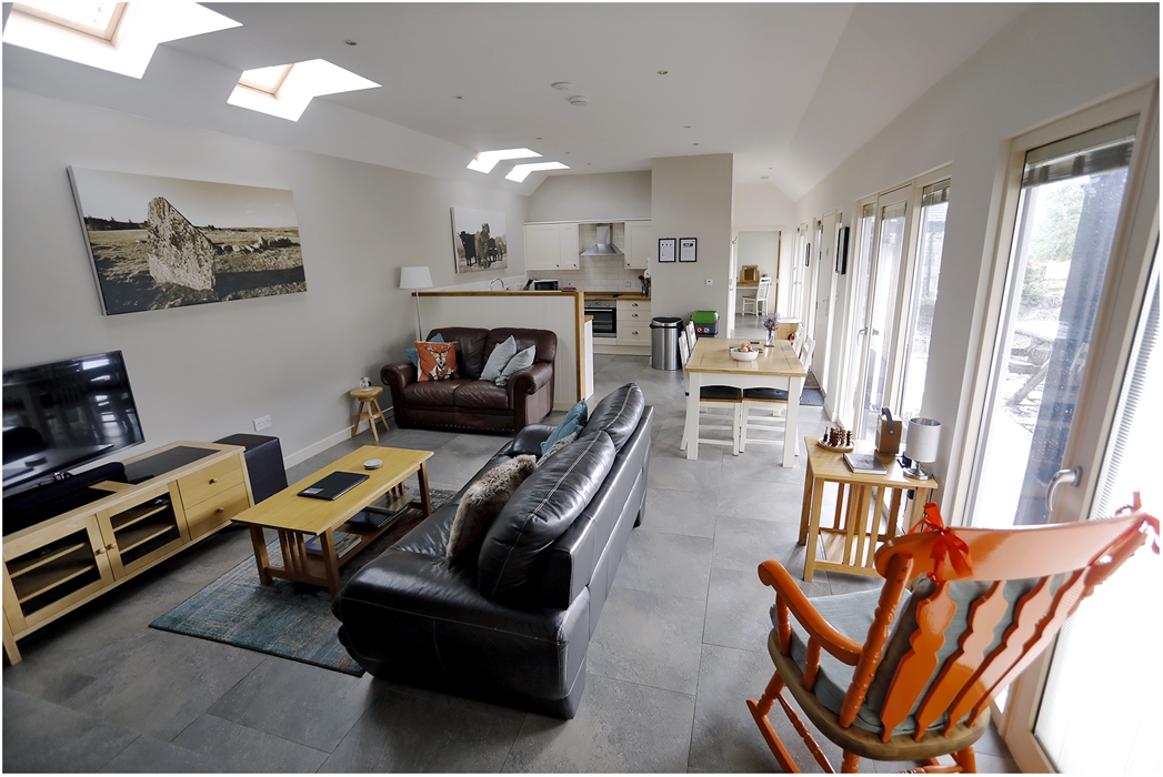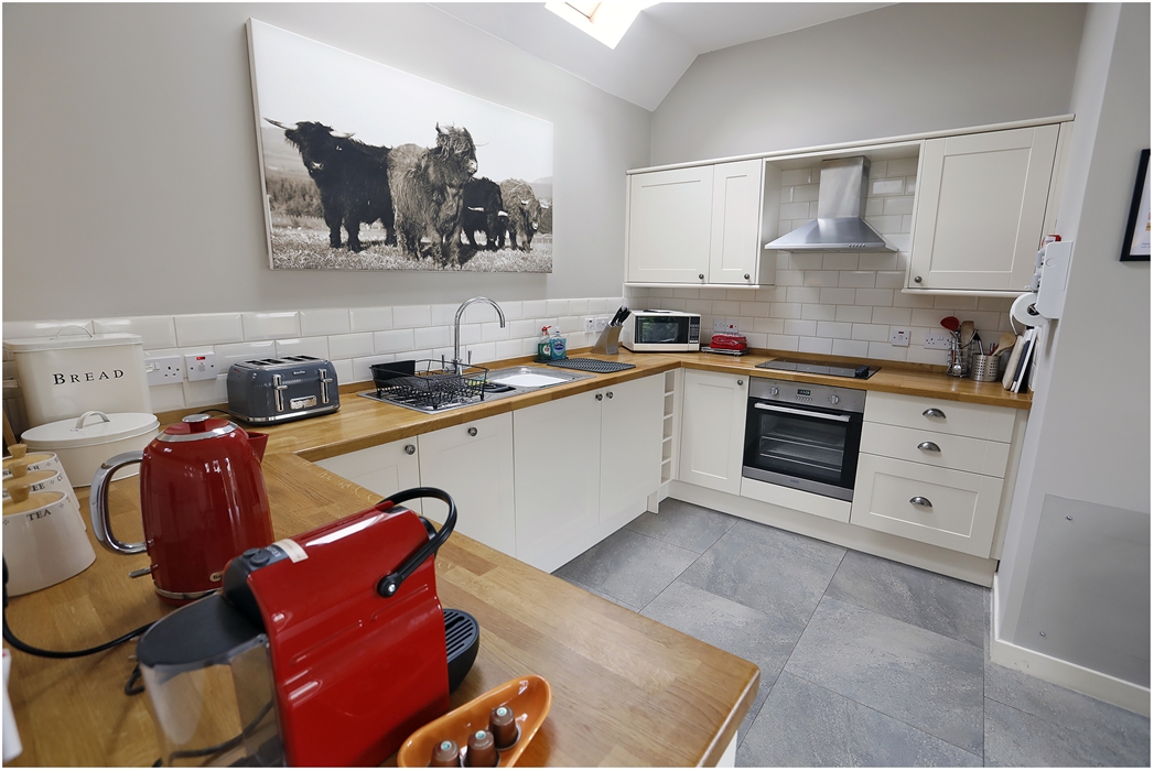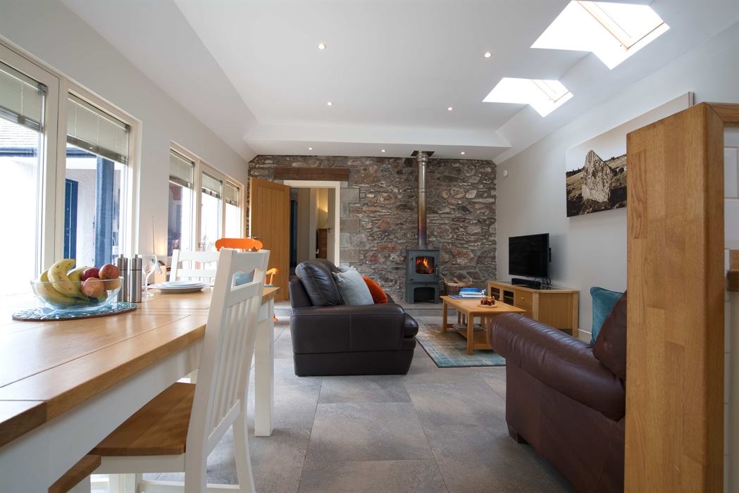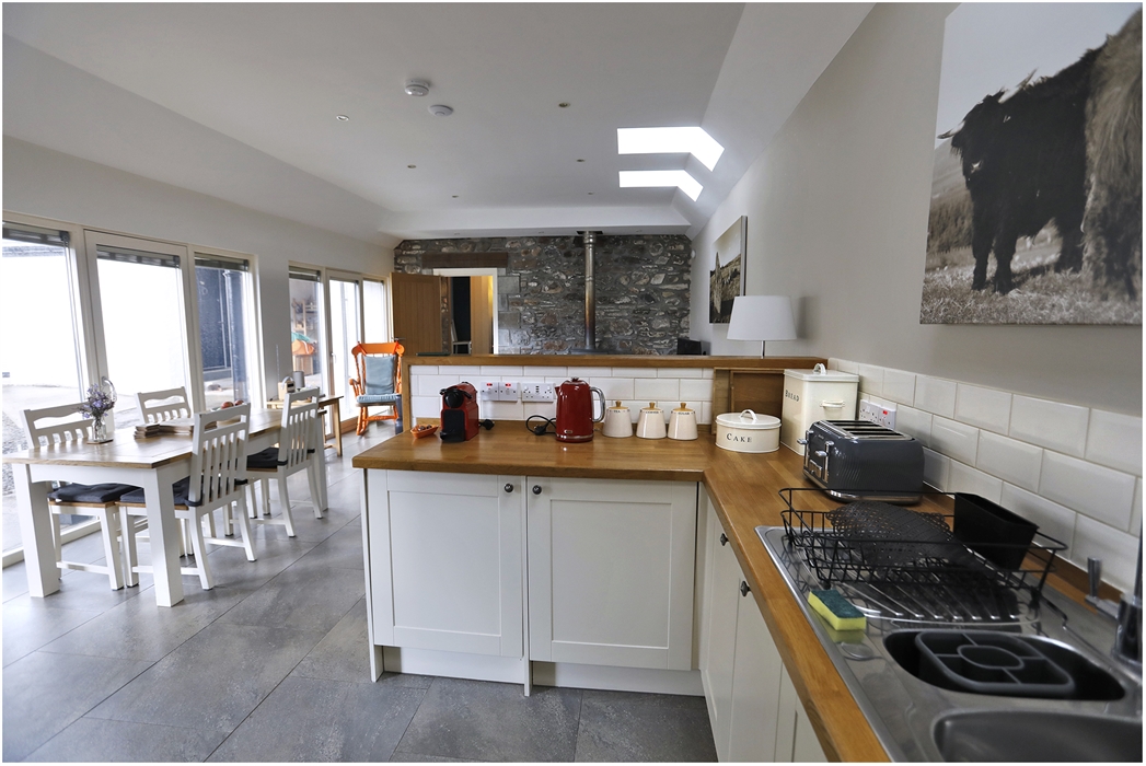 Corrimony Cottage offers a striking and contemporary open plan living area with a wood burning stove, kitchen and dining area, two double bedrooms each with their own separate bathrooms. All areas have underfloor heating.