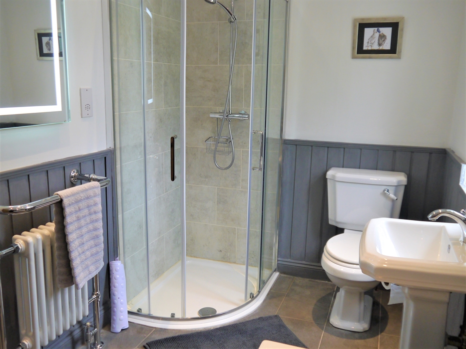 First Floor: Landing leading to; Master bedroom with King size bed, ornamental fireplace and ensuite shower room; King size bedroom with sitting area to take in the countryside views; Twin bedroom; Family bathroom with shower cubicle, bath with hand held shower attachment, WC and wash basin.
