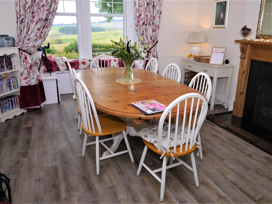 Accommodation for 8 comprising of: Ground Floor: 1 step up into Utility room with Washing Machine, Tumble Drier and Microwave leading to Cloakroom with WC & wash basin; Further step up to open plan Kitchen Dining Room with a range of fitted units, double oven range cooker, dining table for 10, ornamental fireplace and window seat to take in the views across the surrounding countryside; Small hallway leading to Lounge with a wood burning stove (with fuel supplied) and views over open countryside to the hills beyond. Ground floor twin bedroom. Stairs to first floor.