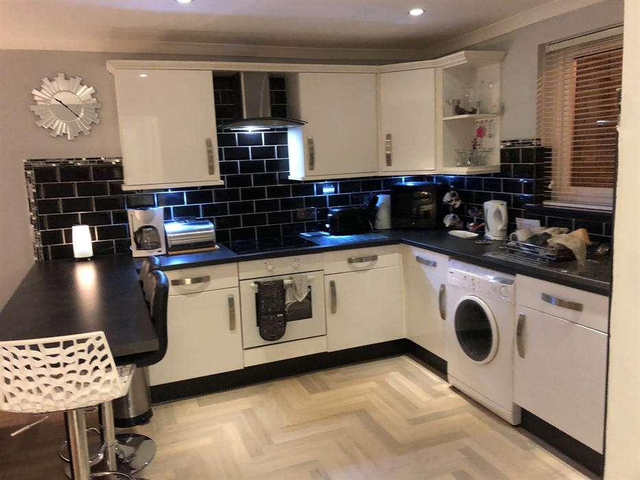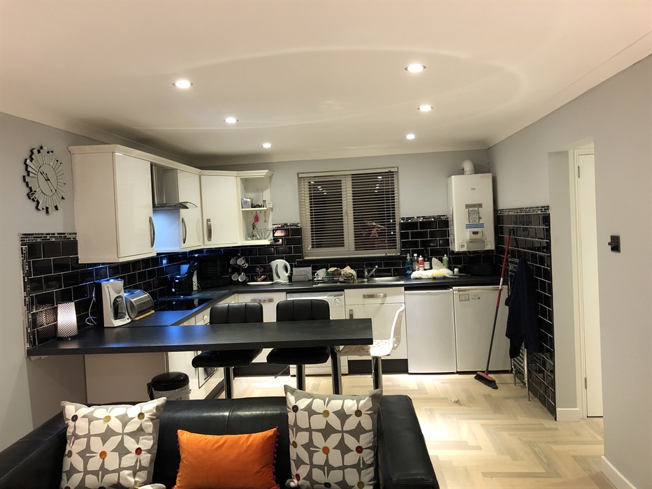 Dining Kitchen: Fully-equipped with Breakfasdt Bar & Stools in Ground Floor Apartment - Table and Chairs.in 1st/top floor Apartment