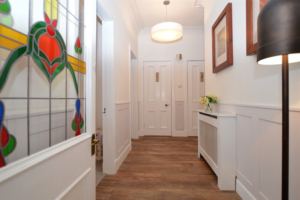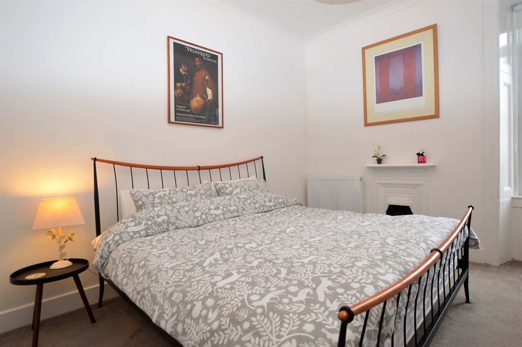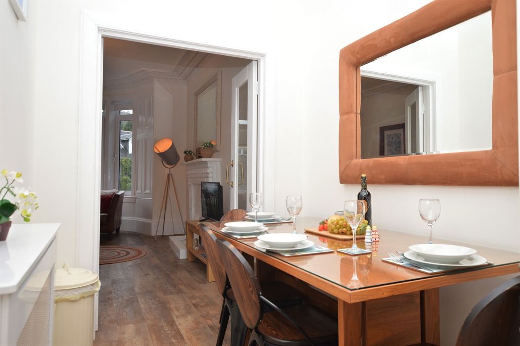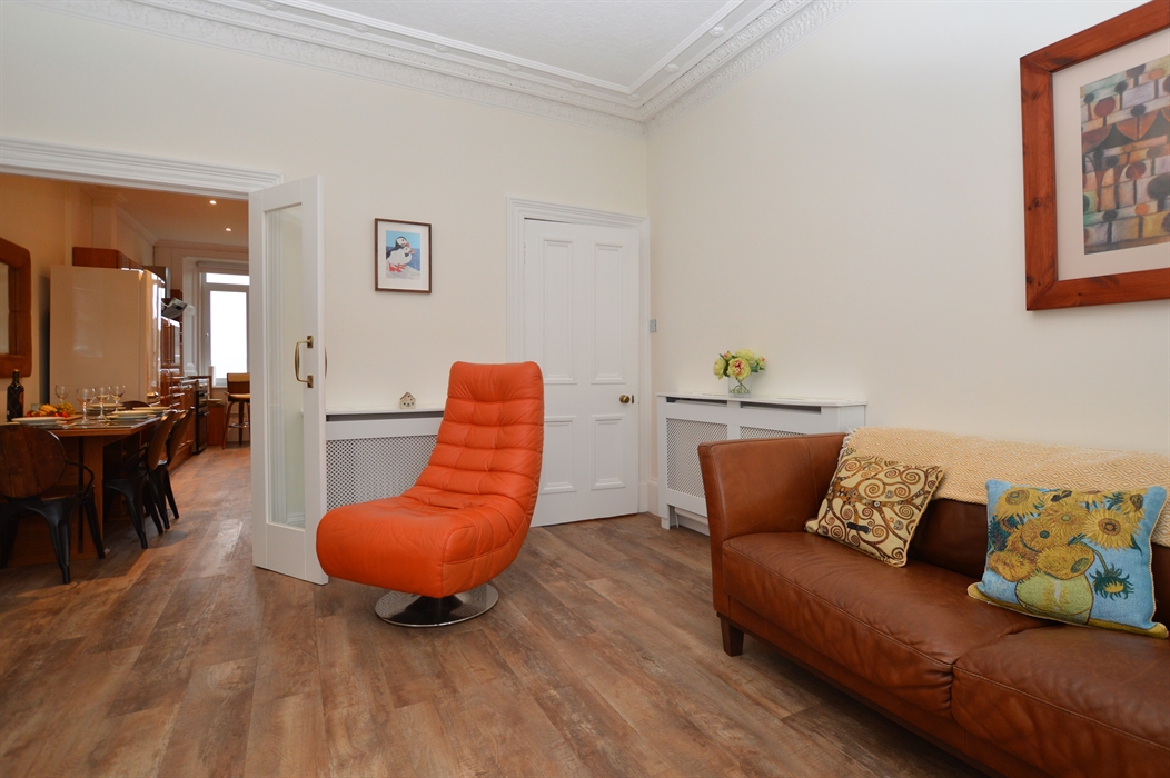 Warm and welcoming with a modern flair, the refurbished apartment features a spacious living room with comfortable leather sofas. The Victorian property retains many of the original features, including high ceilings and spacious rooms.