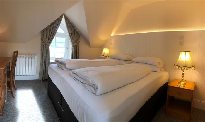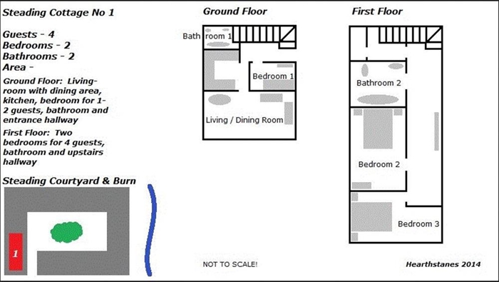 Accommodation for 7 over two floors. Ground Floor: Living room; Dining area; Kitchen: Twin bedroom: Bathroom with over bath shower. First Floor: 1 Double bedroom, 1 Twin bedroom (with sofa bed); Bathroom with over bath shower.