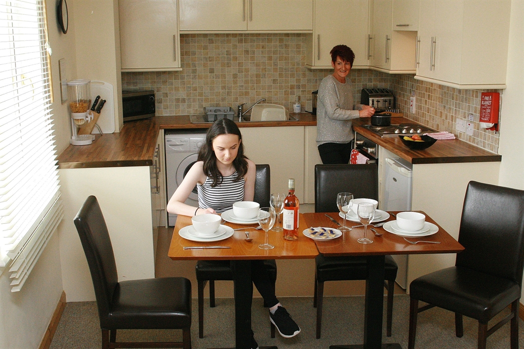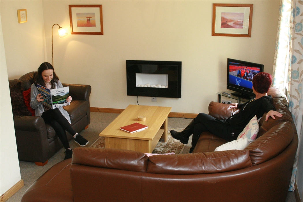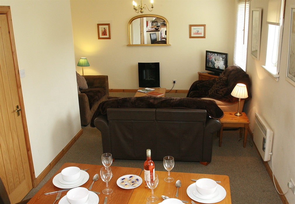 The first of our apartments (number 1) is to be found on the ground floor. It has two bedrooms with a double bed in one and twin beds in the other. Both of the comfortable bedrooms come with ensuite bathrooms for which we are happy to provide your towels. The apartment also has a bright and welcoming living room with a kitchen and dining area at one end. The kitchen comes with all you could need including a washing machine, fridge, microwave and electric oven & hob. For your convenience, we also provide a supply of tea, coffee and cereals. Much needed essentials! The seating area comes with comfortable sofas, a TV with Freeview channels and a living flame fire. Just the thing after a well spent day out walking on a crisp winter’s day.