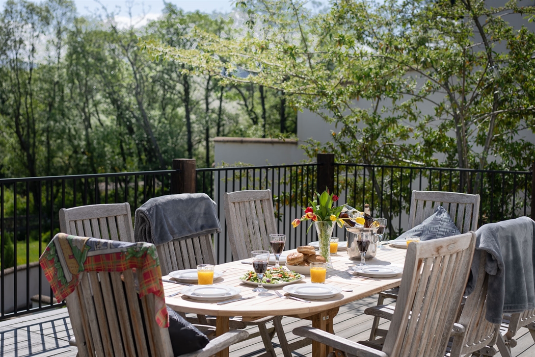 Breakfast on the deck, overlooking the River Spey, with the Cairngorm Mountains in the distance, and watch the elusive red squirrels and other wildlife in the garden, and the ospreys as they fly over the river, to feed in the nearby Fish Farm. It is a great way to start the day.