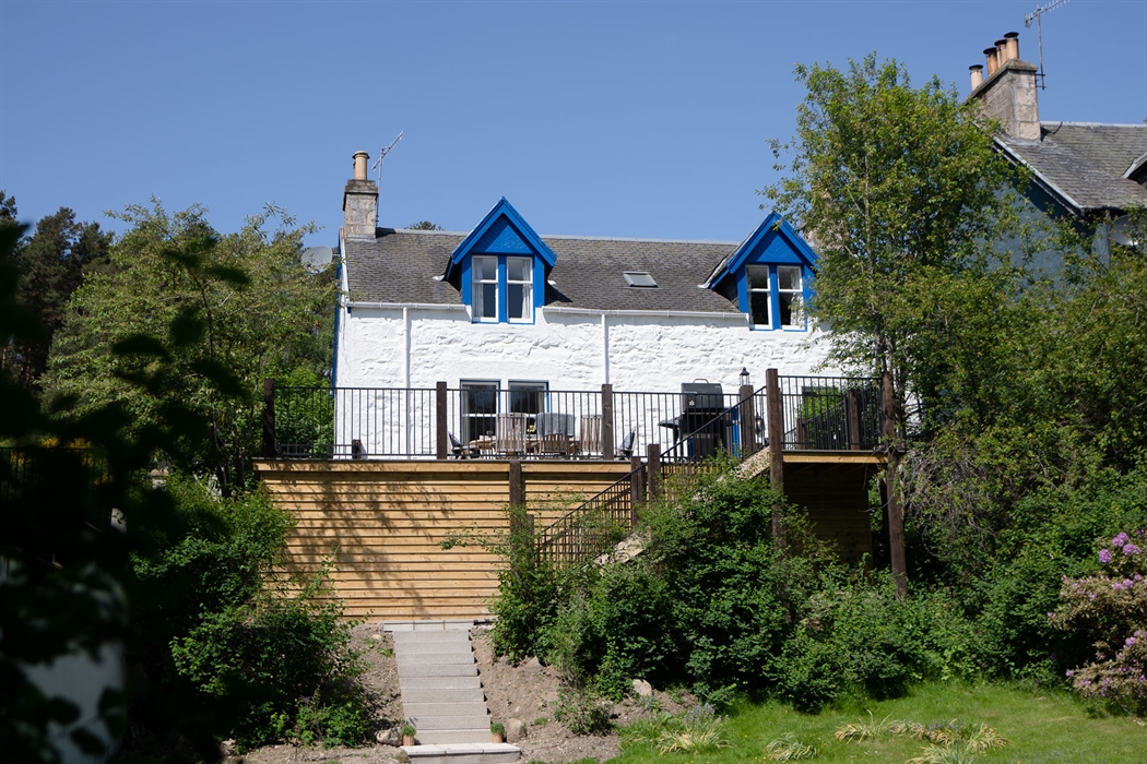 Situated on a very quiet road (cul-de-sac) in between two larger houses in a picturesque wooded area on the banks of the River Spey, but within walking distance of the train station and close to the bus stops in the village, visitors can enjoy the full range of amenities on offer without needing a car.