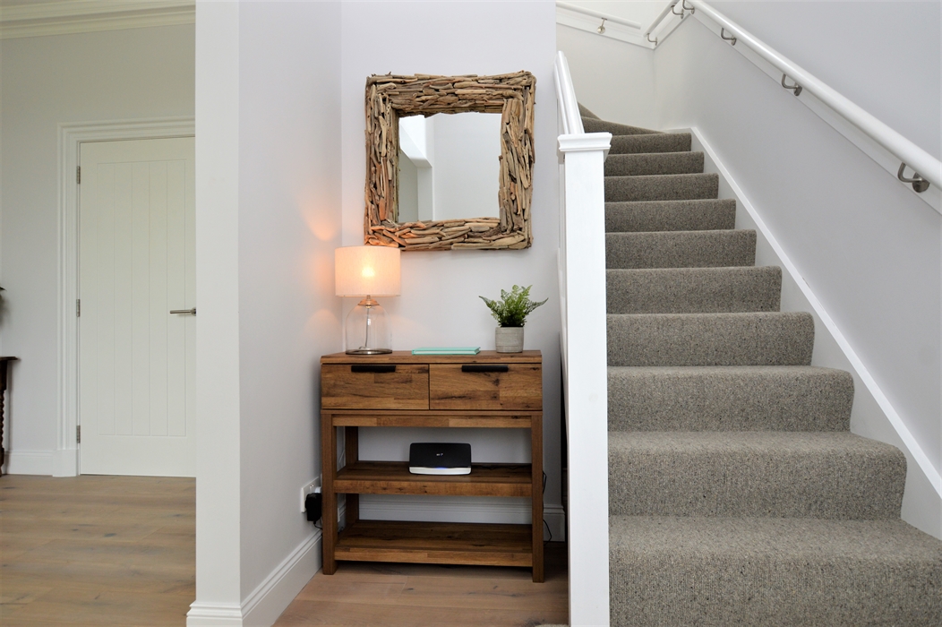 The entrance hall leads you to a staircase that takes you upstairs to an inviting open plan living area with spectacular views, a contemporary kitchen and dining area.
