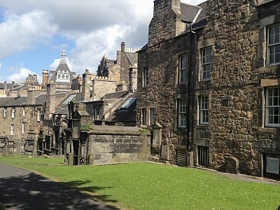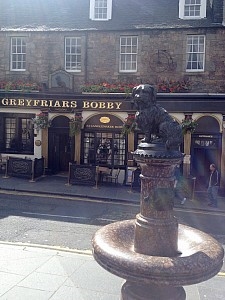 Just around the corner from the apartment is Greyfriars Church (built in 1620) and churchyard. There are many tales attached to Greyfriars, perhaps the most famous of which is that of Greyfriars Bobby, a faithful Skye terrier. So devoted was the dog to his master John Gray that when Gray died and was buried in Greyfriars Churchyard, Bobby kept guard over the grave for fourteen years until his own death in 1872. The dog is buried close to his master and his faithfulness is commemorated in a statue opposite the entrance to the churchyard at the junction of George IV Bridge and Candlemaker Row.