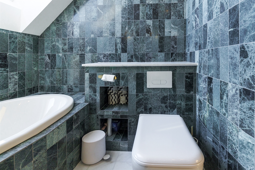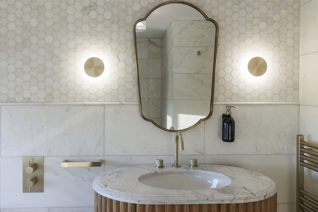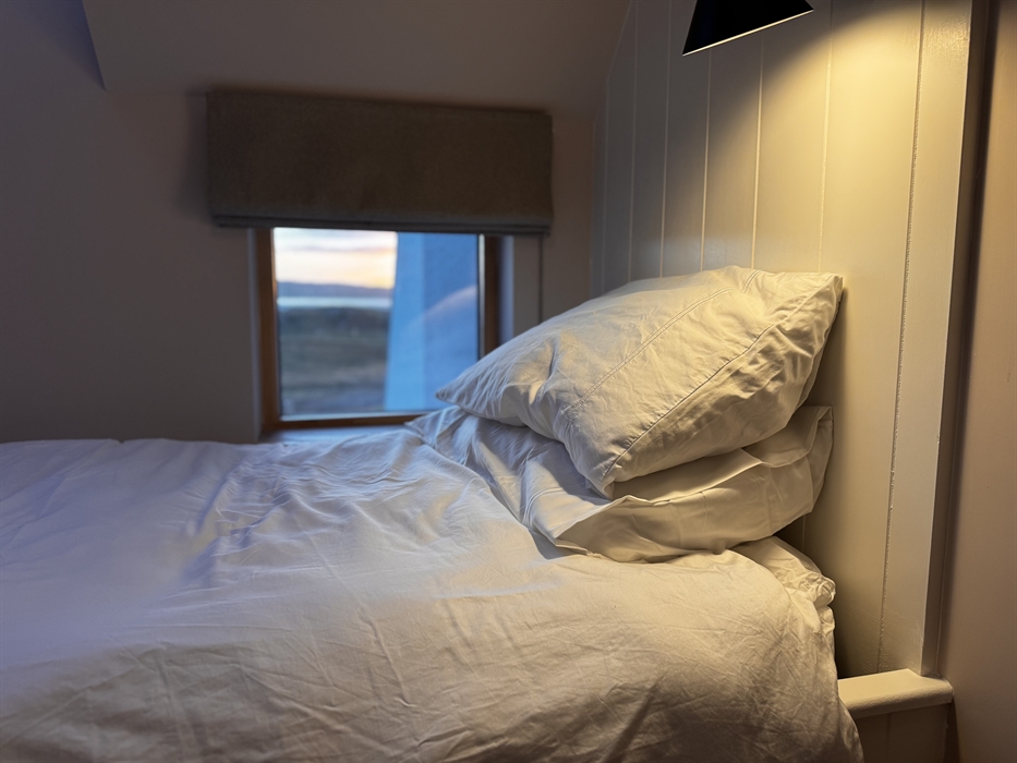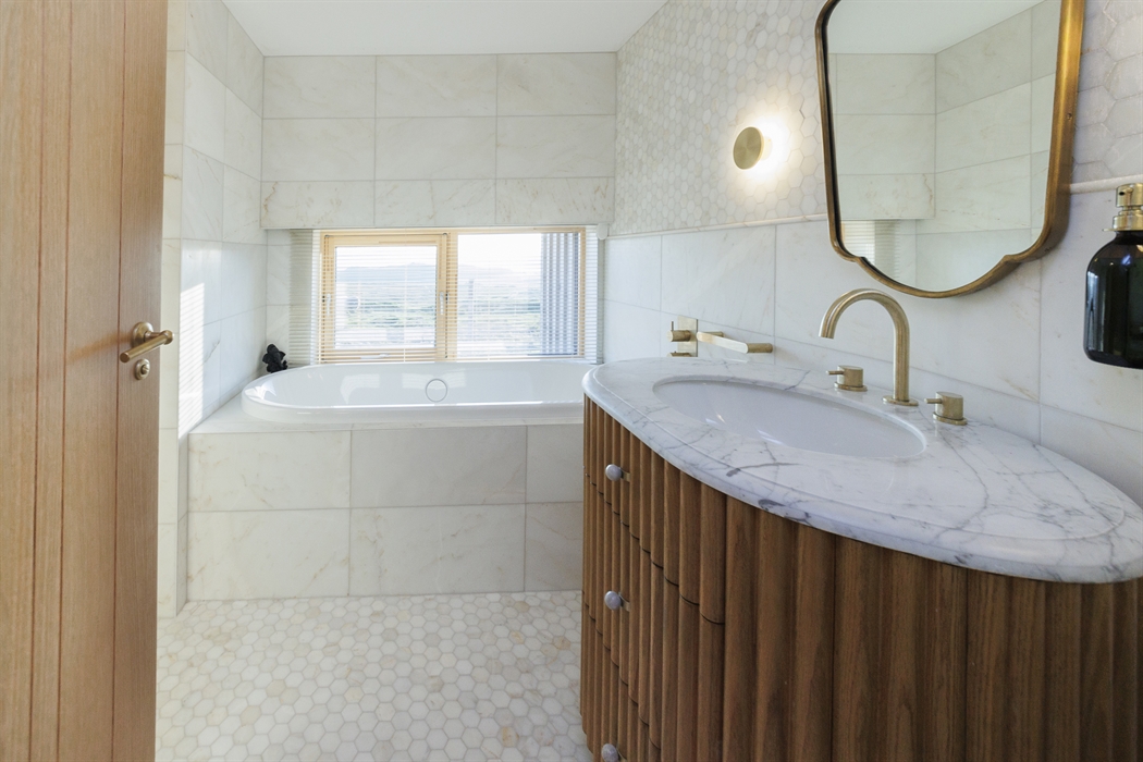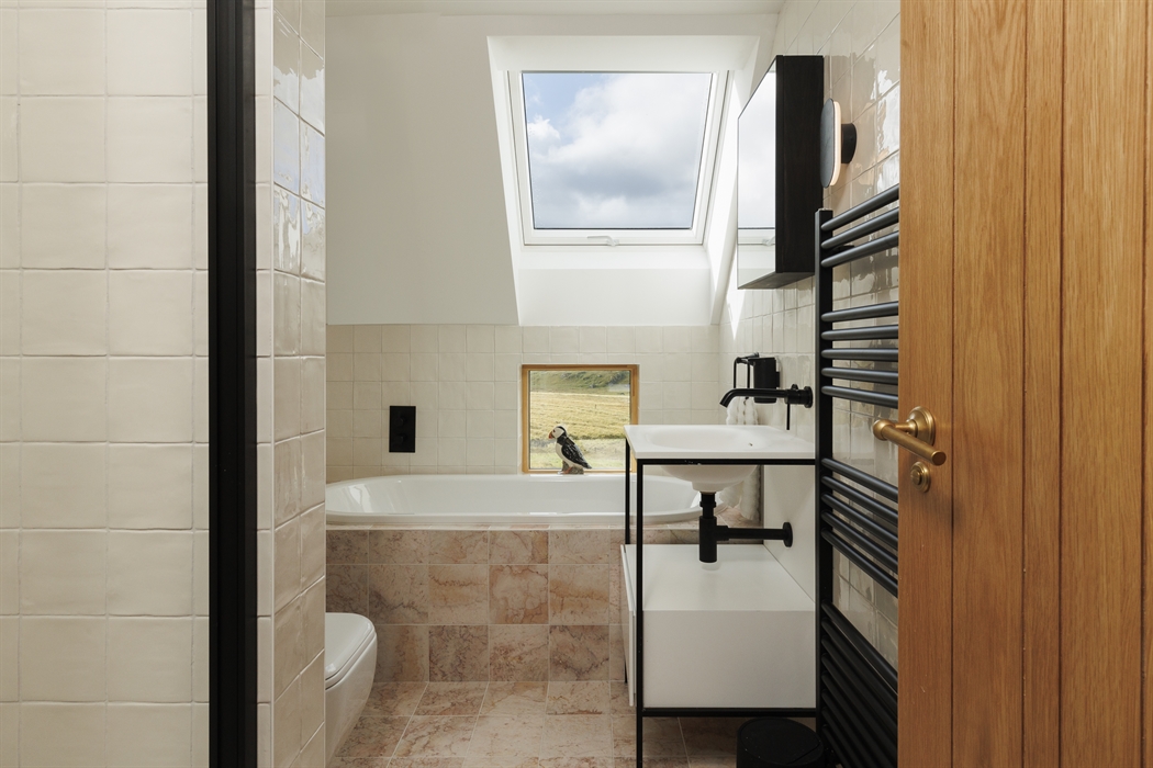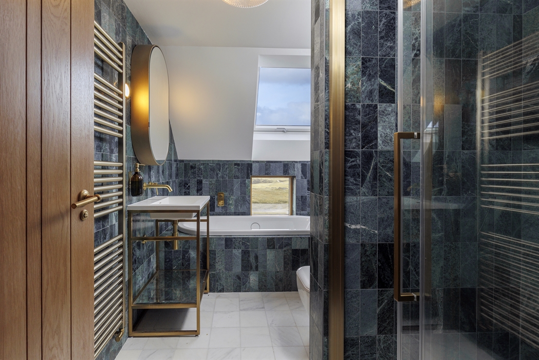 In the main house, there are two upstairs king-sized bedrooms, a cosy single cabin bed with a trundle underneath designed specifically for kids, plus two marble-tiled bathrooms both with bathtubs overlooking the beach and hills. The master bedroom has a bespoke glass window that runs down the wall and into the ceiling so you can watch the sky and scenery from the Soho Home bed. And when it’s time to sleep, there is a motorised curtain controlled from a button next to the bed. Downstairs in the main house is an accessible king-sized bedroom with views across Uig Sands and the hills, plus an accessible shower room finished in Bert & May tiles.