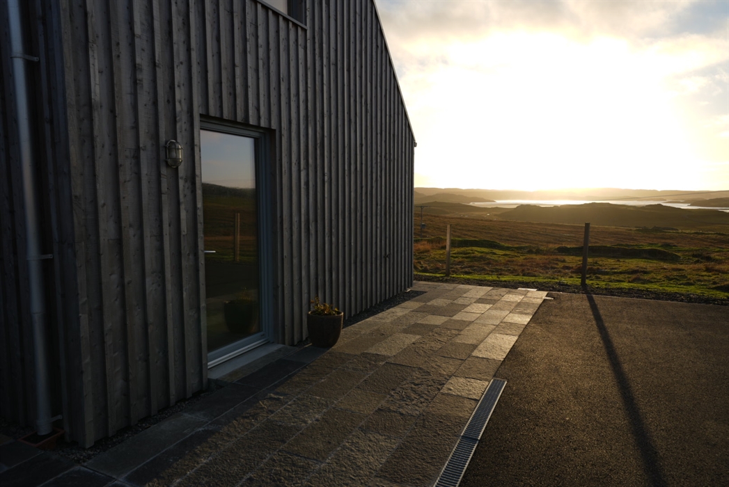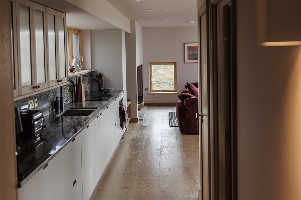 The house’s two living spaces have been designed to showcase the views: large triple glazed windows ensure the best vantage point for Uig Sands, the hills down towards Harris, and the weather as it changes throughout the day. In the main house living area, there are two huge sofas and a Charnwood stove, plus a dining table that extends to seat 10 comfortably. The house has Starlink internet access throughout, a Sonos audio system plus an LG smart TV including subscription services such as Netflix, Apple TV+, Disney+. The main kitchen is fully kitted out for those that love to cook, with granite worktops, a Bora induction hob, Miele fridge freezer and oven, and a Quooker tap. The annexe has its own living area with double-height ceilings, sliding doors onto the patio, plus comfortable couches, a Charnwood stove, a Sonos system as well as a dining table for two. The kitchen includes Miele appliances, an undercounted fridge with ice box, plus a washing machine/dryer.