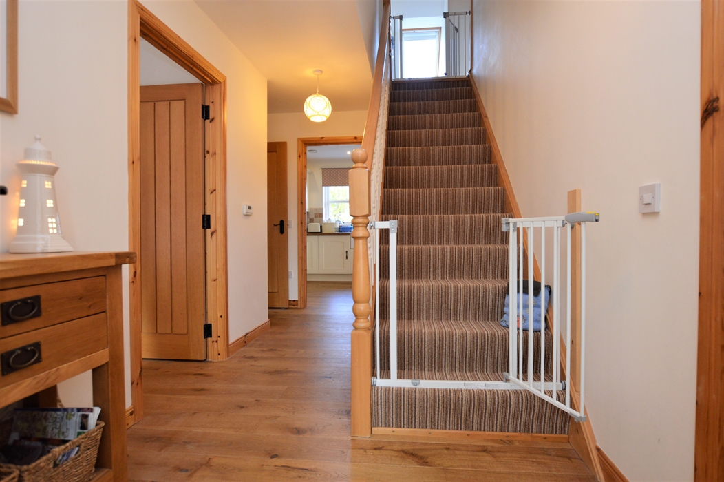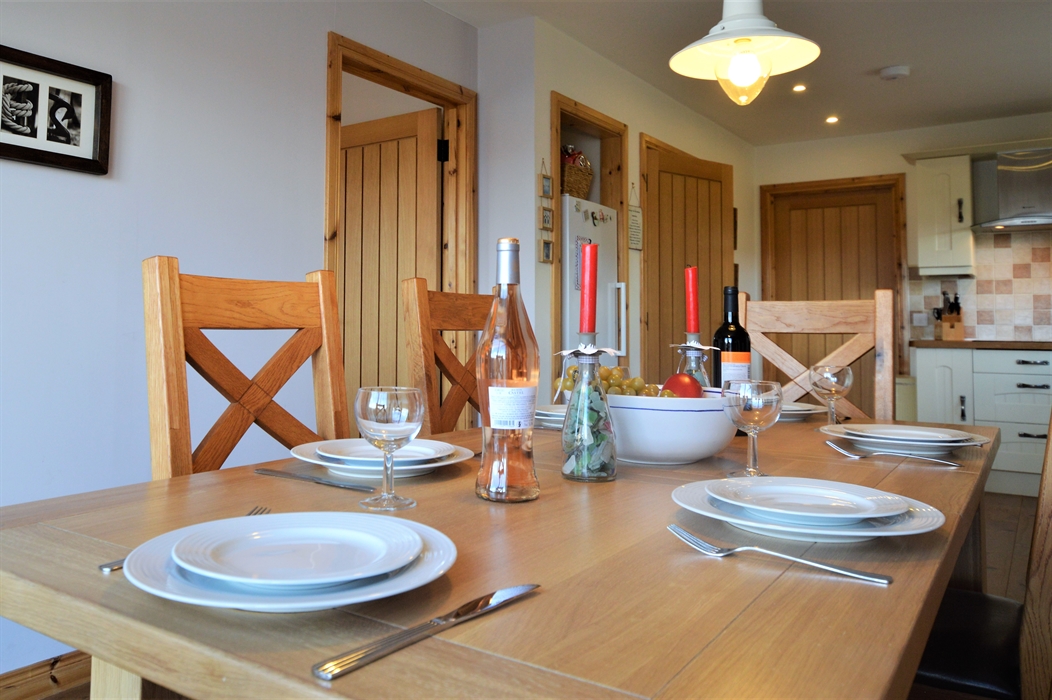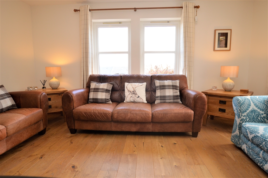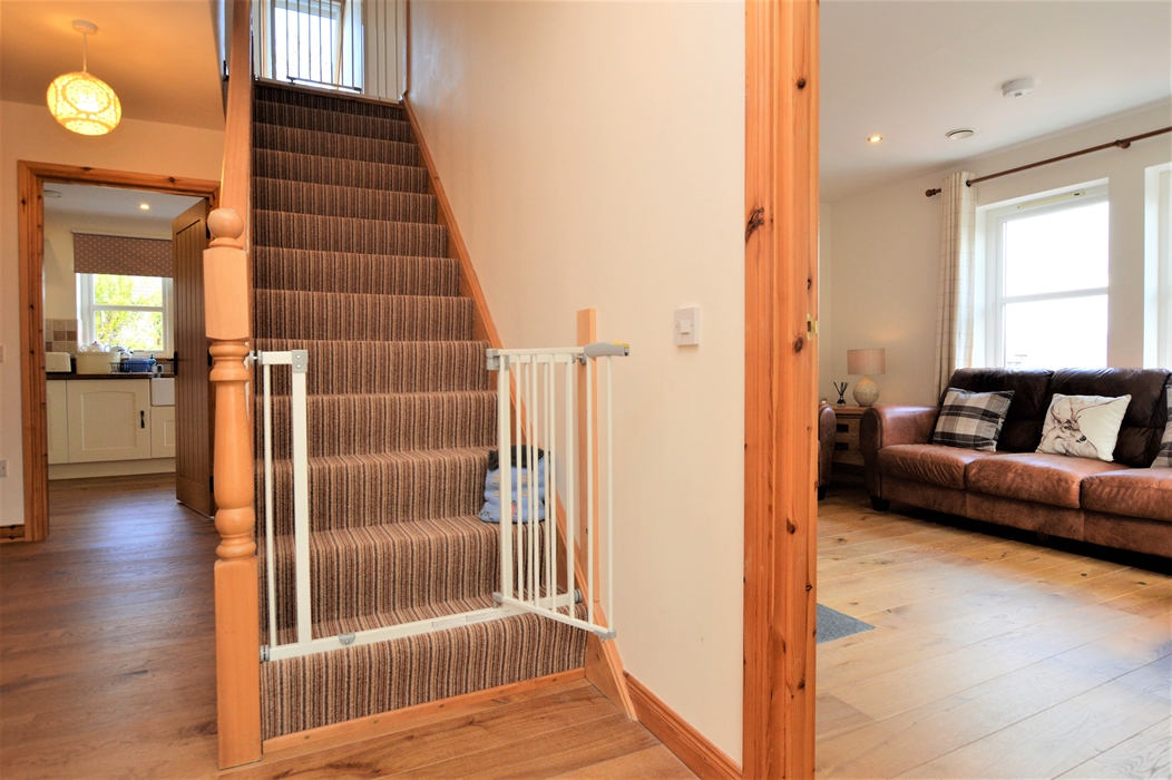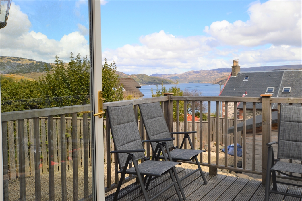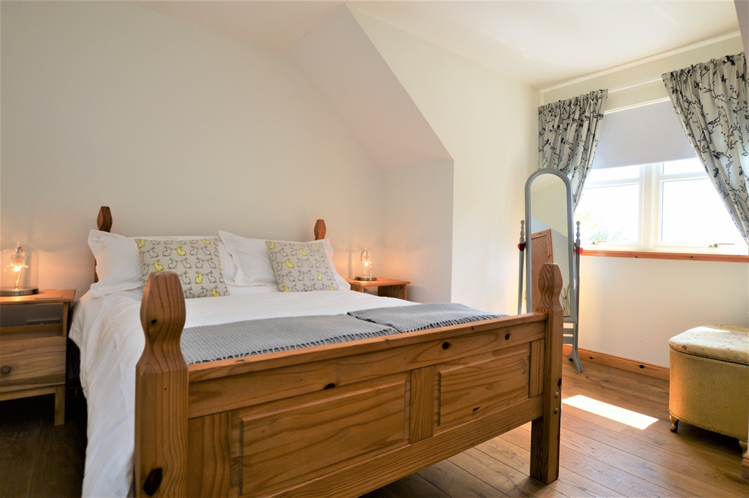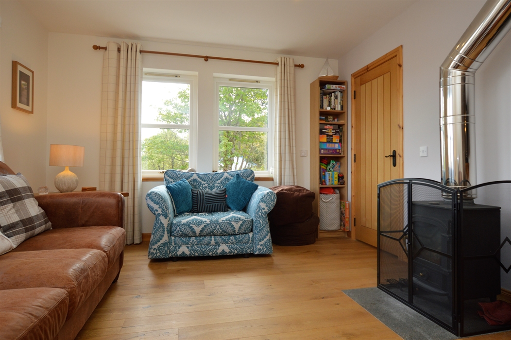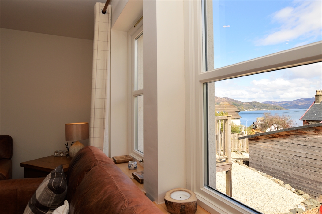 The ground floor features the living room, with a wood burning fire, comfortable sofas and windows to enjoy the ever-changing views over the Kyles. The kitchen is spacious and fully equipped with all your modern appliances. The dining area is a wonderful space for casual meals, with patio doors that open up onto the terrace decking.