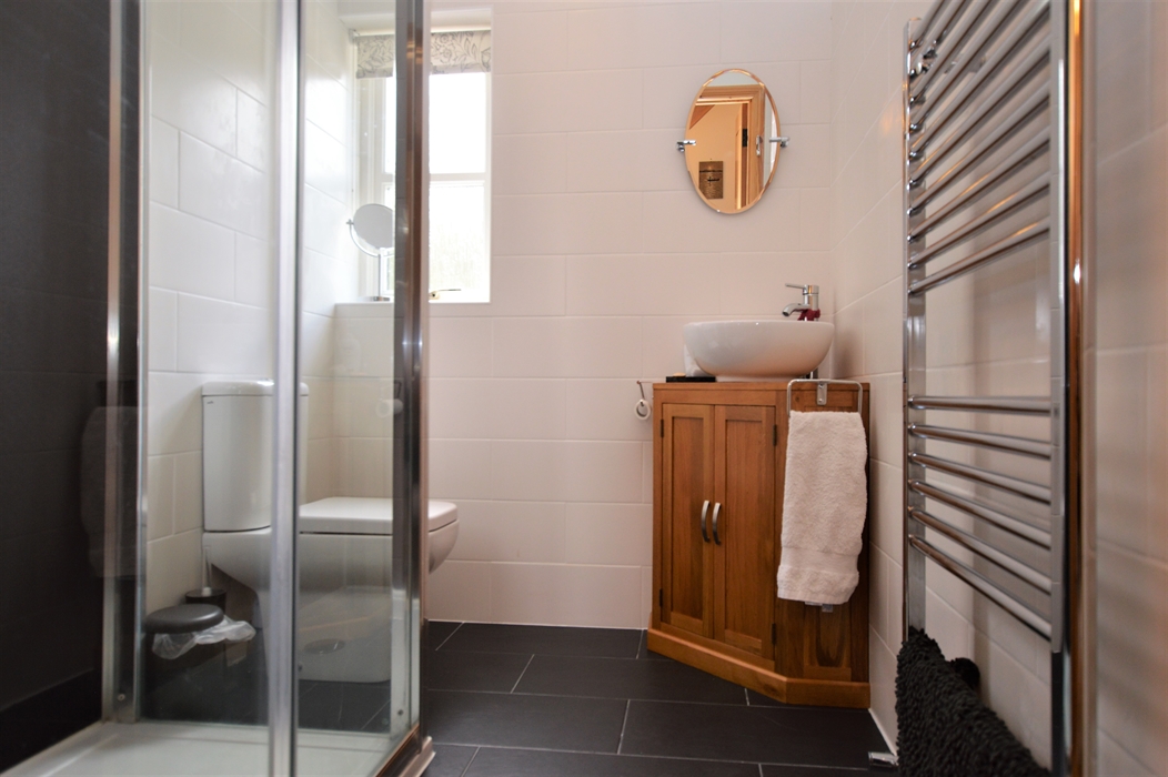 Bathroom 2: Upstairs the family bathroom features a walk-in shower, hand basin and toilet.