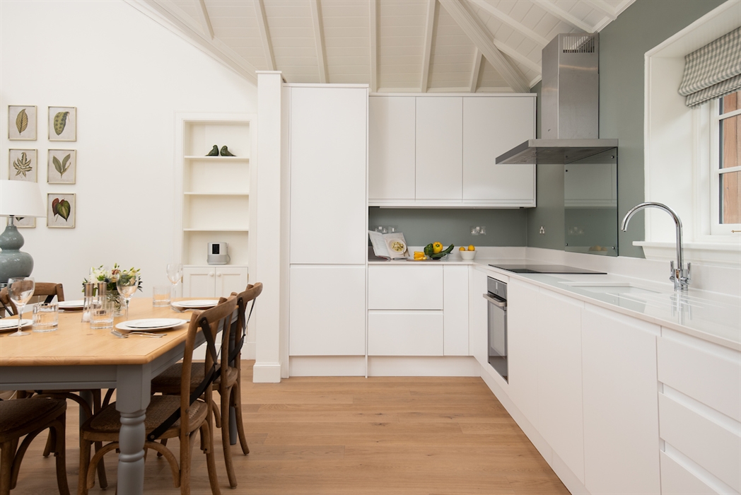 Rooflights bathe this interior in light, creating a shift in mood as the sun moves around the cottage, casting intriguing pools of light and shadows throughout the day. The aesthetic throughout blends classic and contemporary styling, with a neutral colour palette and wide plank oak flooring that enhances the flow between the different zones.