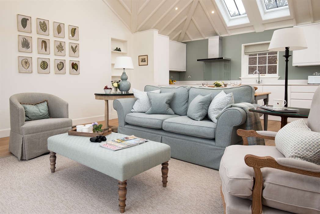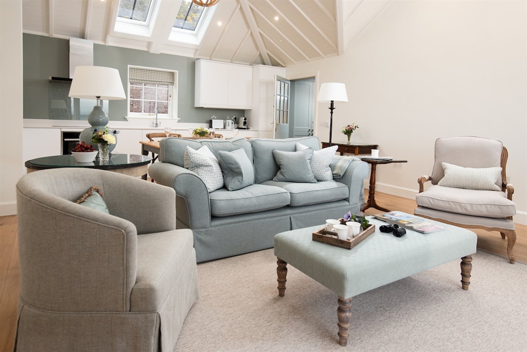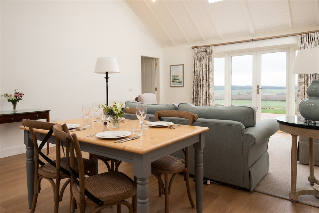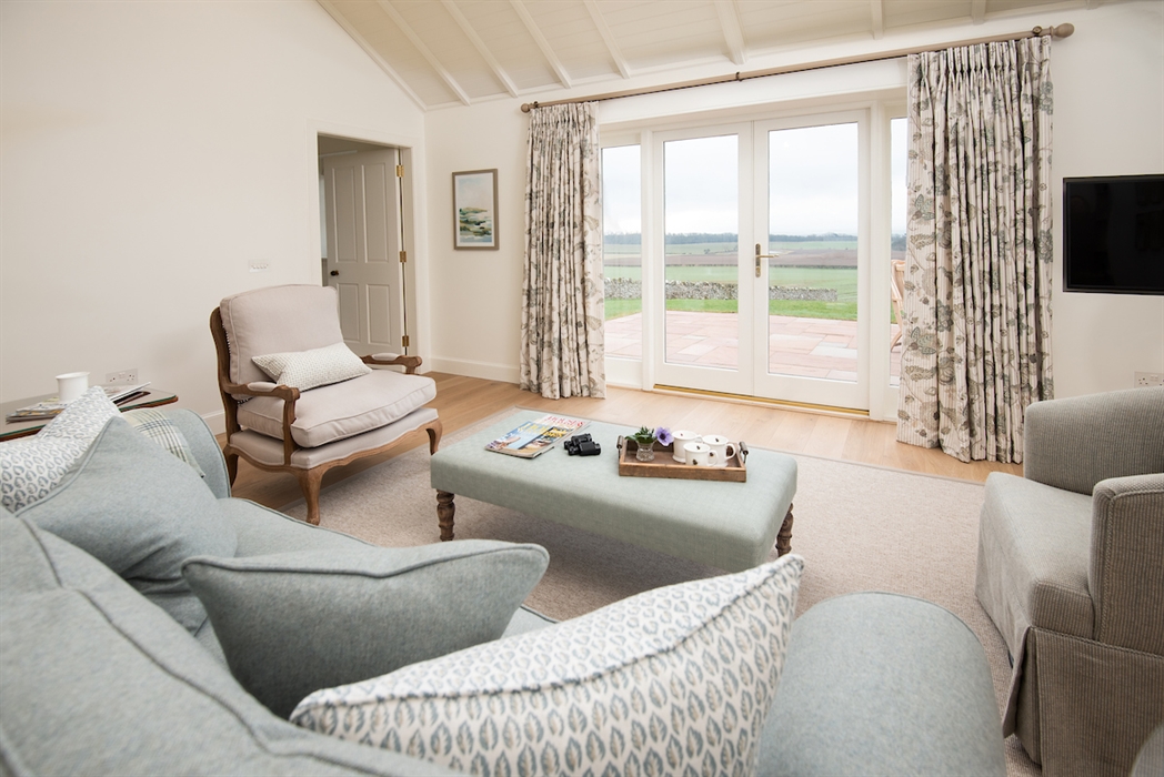 Double sofa, two armchairs, Smart TV, Bose Bluetooth speaker. Double doors to the patio with far-reaching views over open countryside.