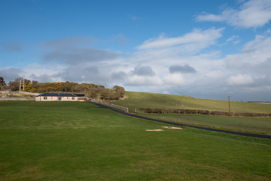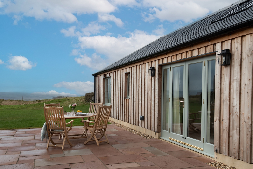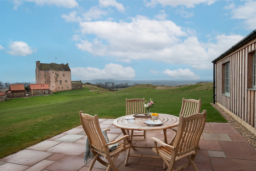 Patio to the front of the property with open grounds leading down to Fenton Lodge and Fenton Tower. Hillside Cottage sits in an elevated position and benefits from far-reaching views.