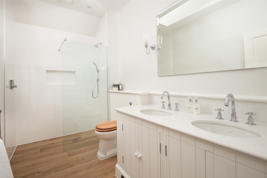 En suite bathroom with large wet-room style shower, heated towel rail, double basin and WC.