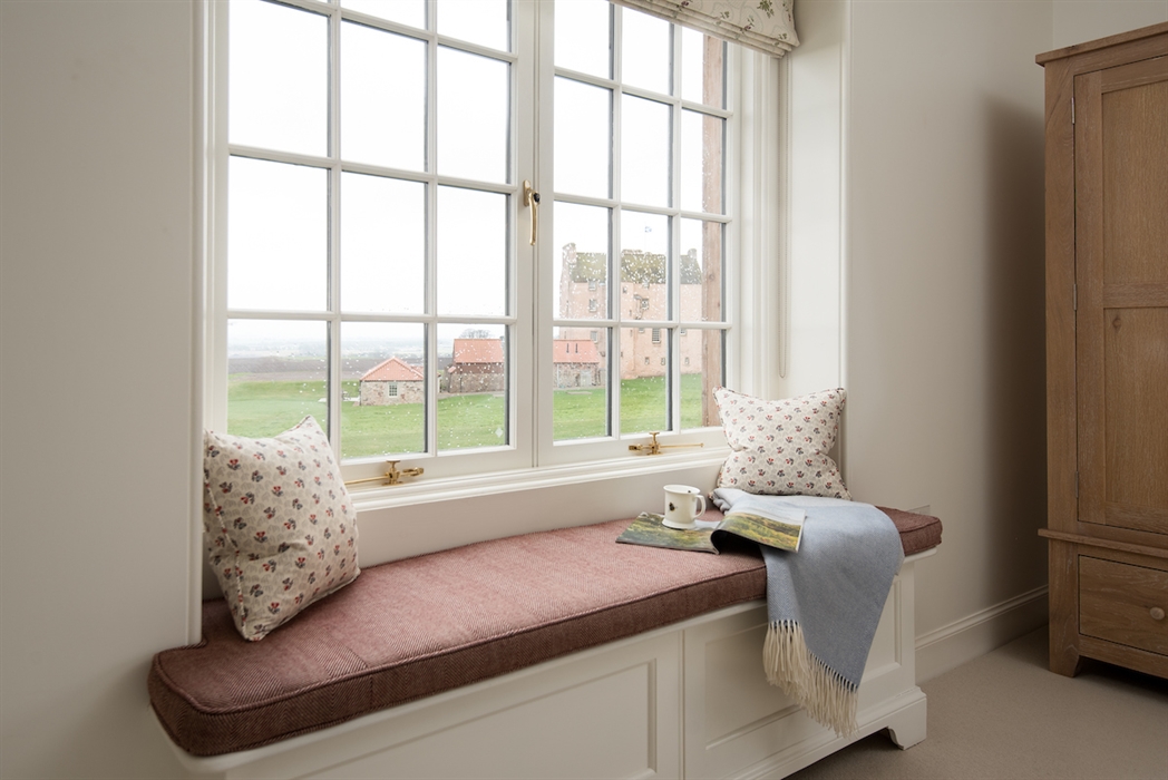 The bedrooms have a sophisticated vibe with their combination of upholstered beds and French-style painted furniture, and with a colour palette of dove grey and chalky tones of sky blue and pale olive. Upholstered window seats create quiet nooks to settle with a morning coffee, gazing out towards the countryside that surrounds Fenton Tower and simply enjoying this tranquil setting. The en suites again offer a fusion of traditional and modern with painted cabinetry and classic fittings, complemented by a large walk-in shower in one, and a bath and shower combo in the other.