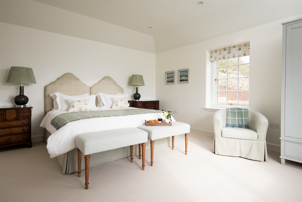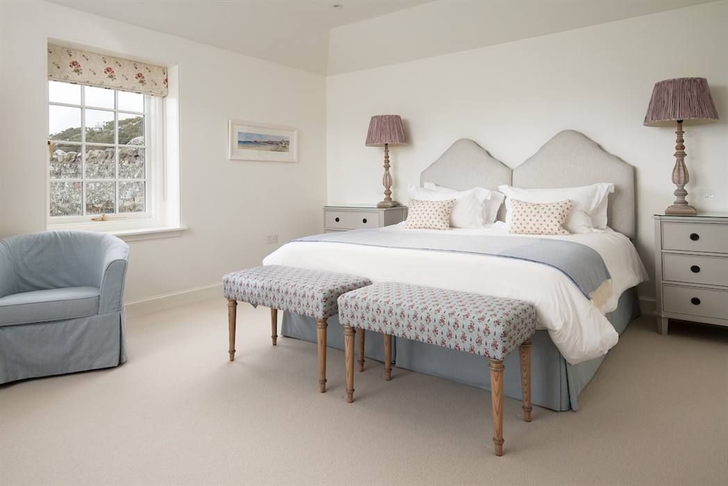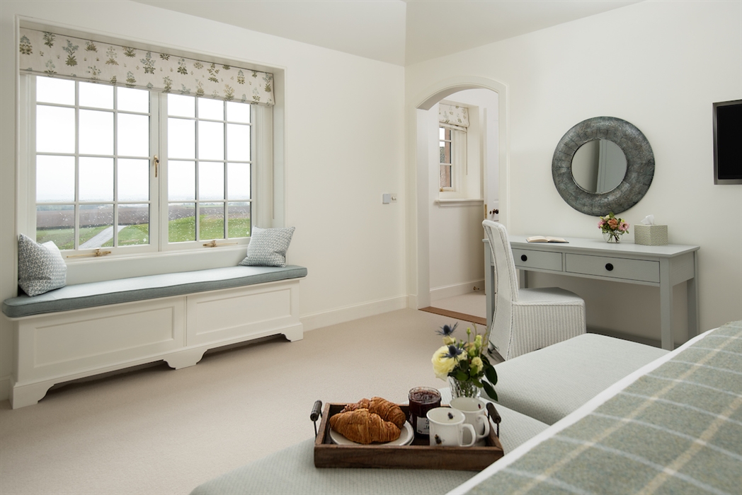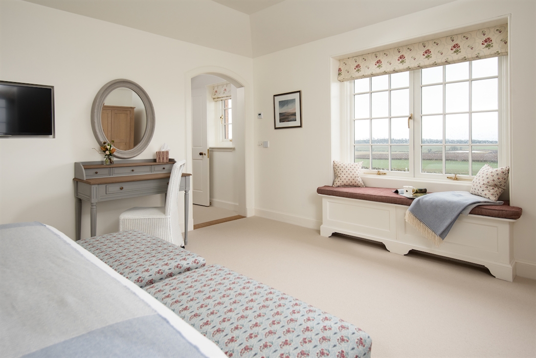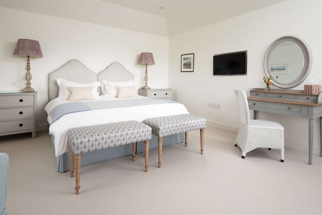 West bedroom with super king bed with zip and link option which can be configured to 3' twin beds, bedside drawers, dressing table, wardrobe, window seat, wall-mounted Smart TV, two chairs.