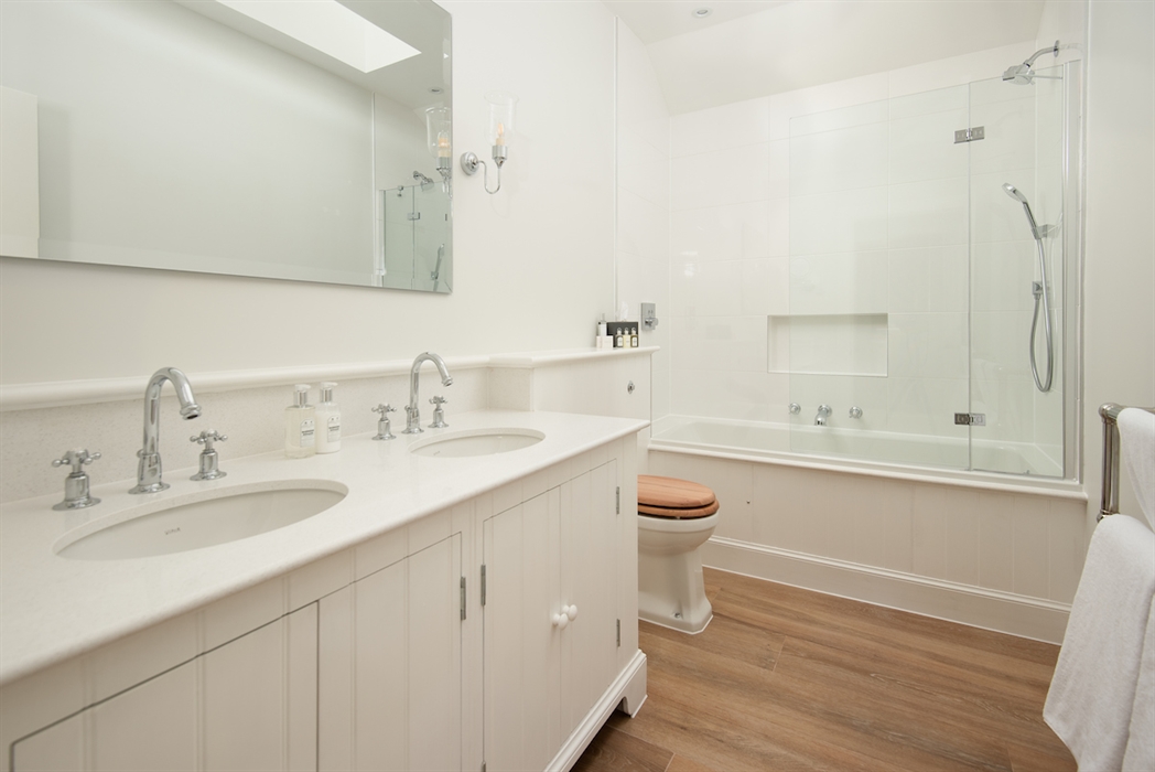 En suite bathroom with bath and shower over, heated towel rail, double basin and WC.