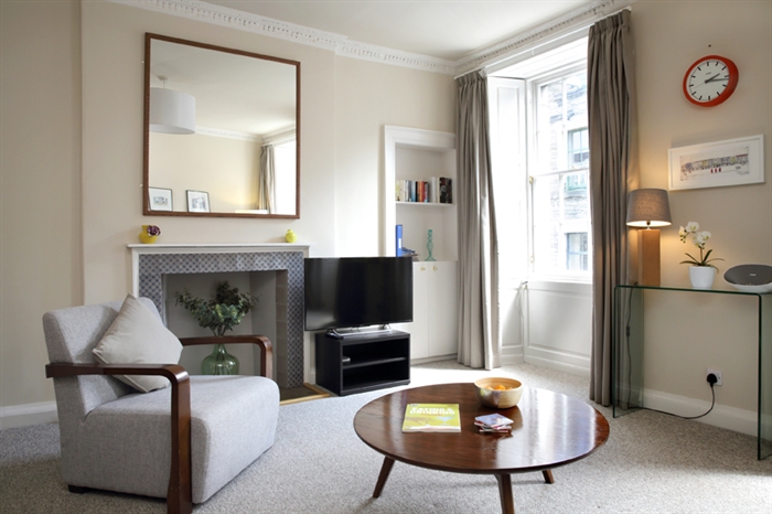 The apartment is accessed through a secure door with intercom via Thistle Street. The apartment itself is on the second floor within a traditional Edinburgh stairwell.