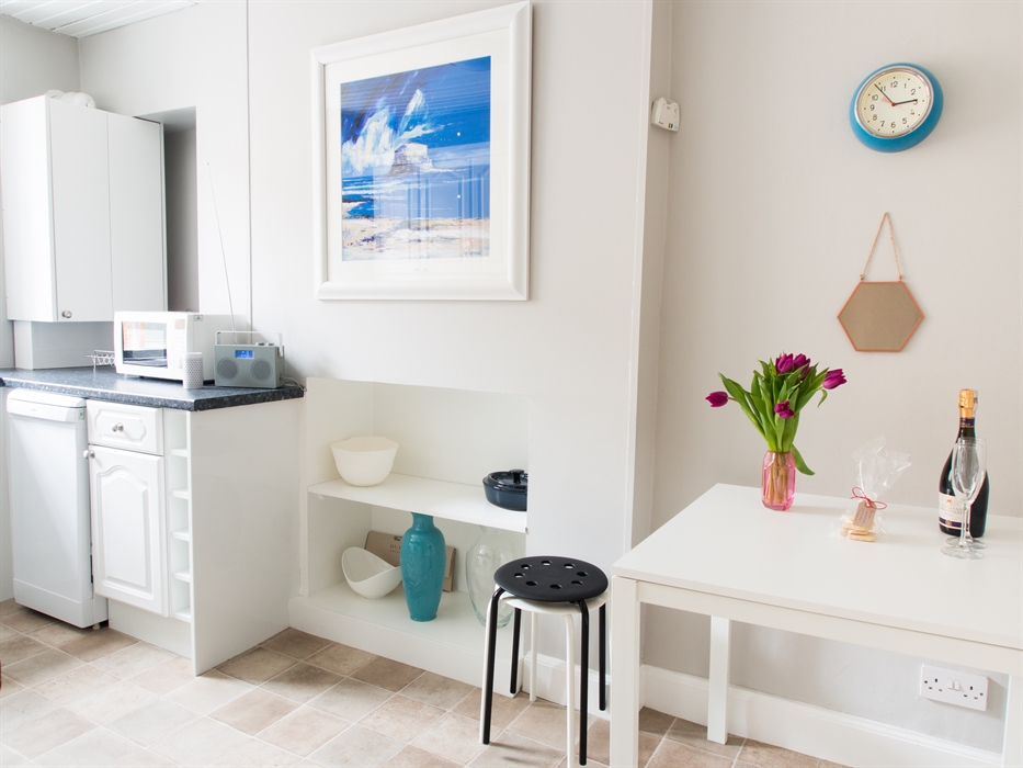The ultra-comfortable hotel-style shower room has underfloor heating and a powerful shower. We provide a full range of toiletries (shampoo, conditioner, body wash, hand wash & body lotion) so you can travel light. The large bedroom is quietly located with a very comfortable king size bed, Egyptian cotton sheets, working shutters and lots of storage space. The dining kitchen has a dishwasher, microwave, washing machine and dining table, well stocked with complimentary breakfast cereals, milk, tea and good coffee. You’ll find all the kit you need if you want to cook.