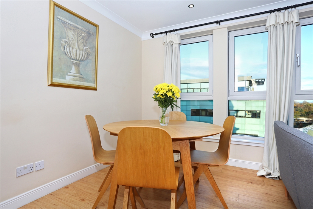 This bright and uplifting top-floor flat is located on the sixth floor. Spacious windows in the living and dining room highlight stunning views towards Salisbury Crags and Arthur’s Seat. Hardwood floors and comfortable sofas create a modern and relaxing space. The room also includes a television and well-stocked bookshelf. The dining table in the living area seats up to four.