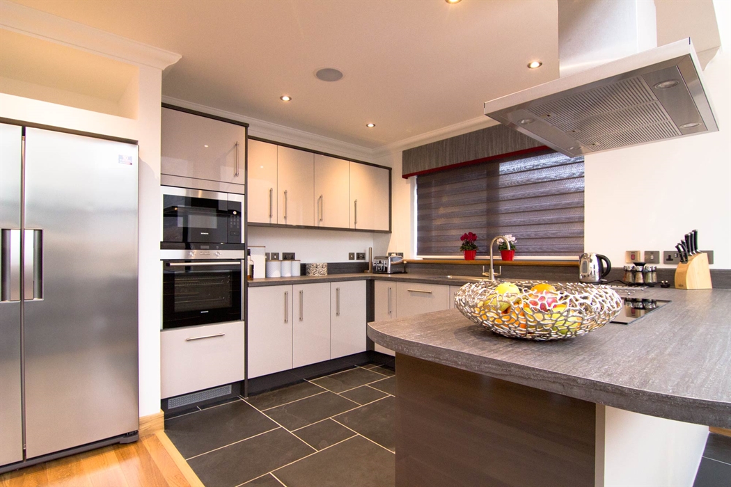 Fully fitted and well equipped open plan kitchen complete with dishwasher, large American style fridge freezer with water and ice dispensers.