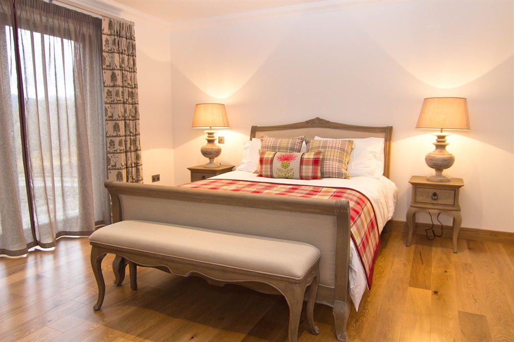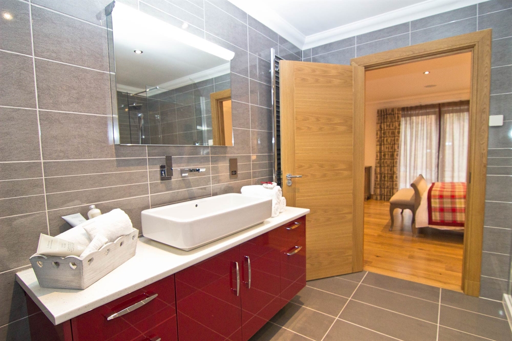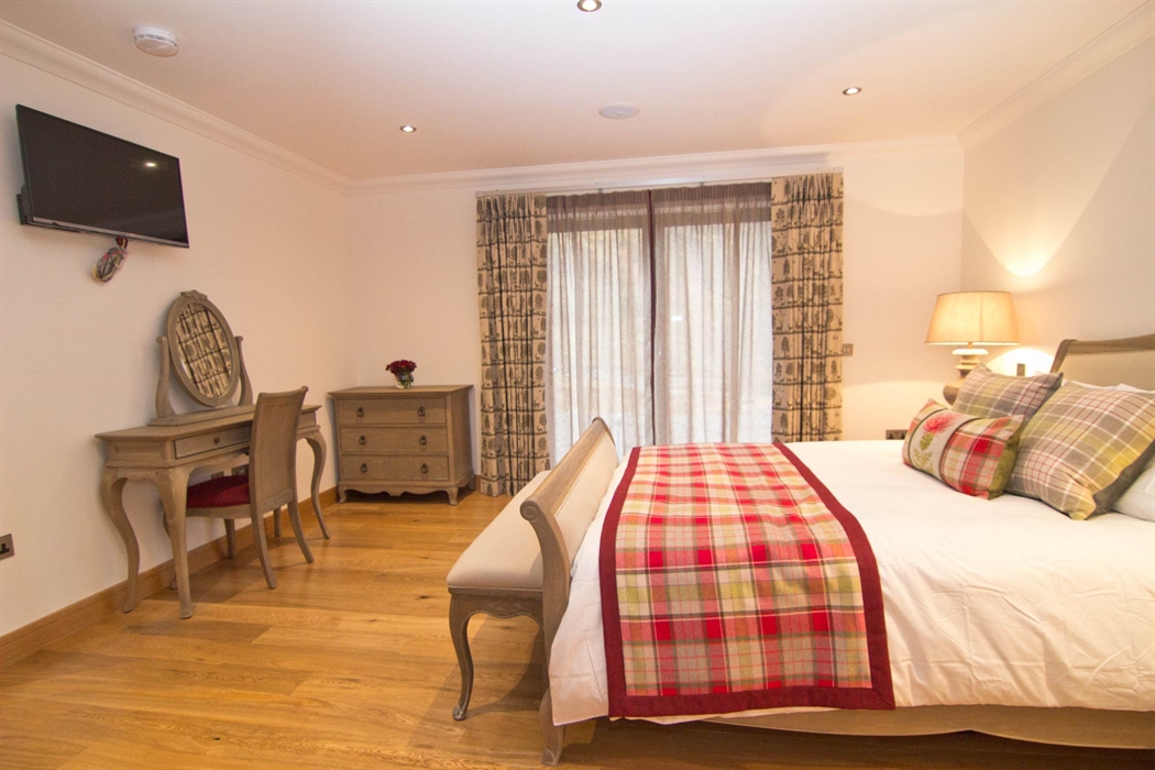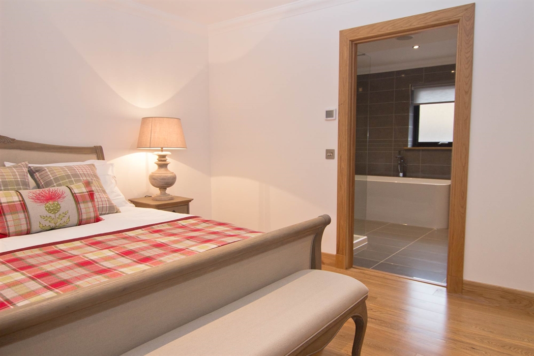 Ground floor large double bedroom with luxury en-suite bathroom, flat screen TV and music system, the bedroom has French doors leading to decking, hot tub and sauna area.