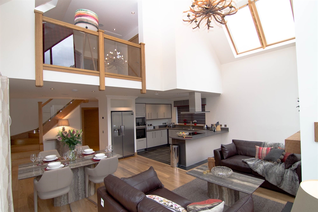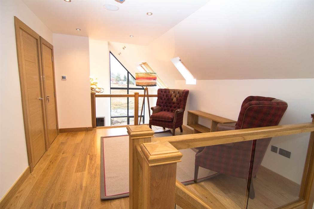 Upstairs gallery area looking over lounge with views through the glazed gable windows, this is an excellent place for relaxing with your book and listening to your favorite music.