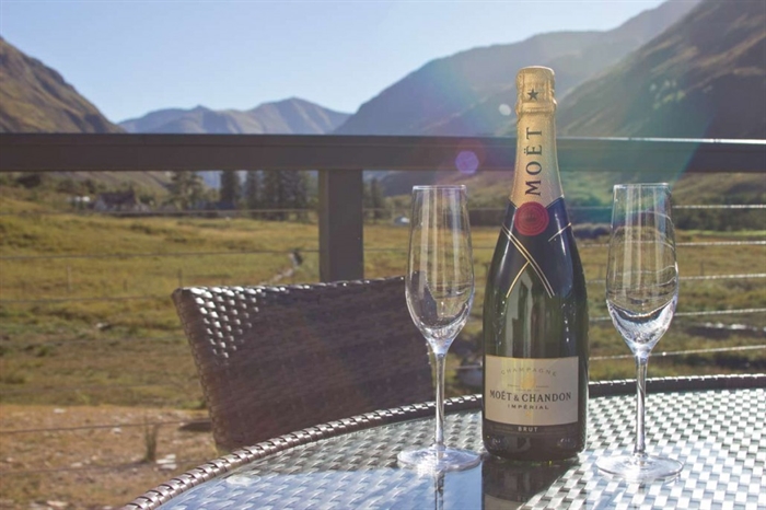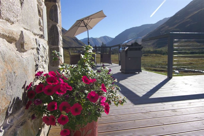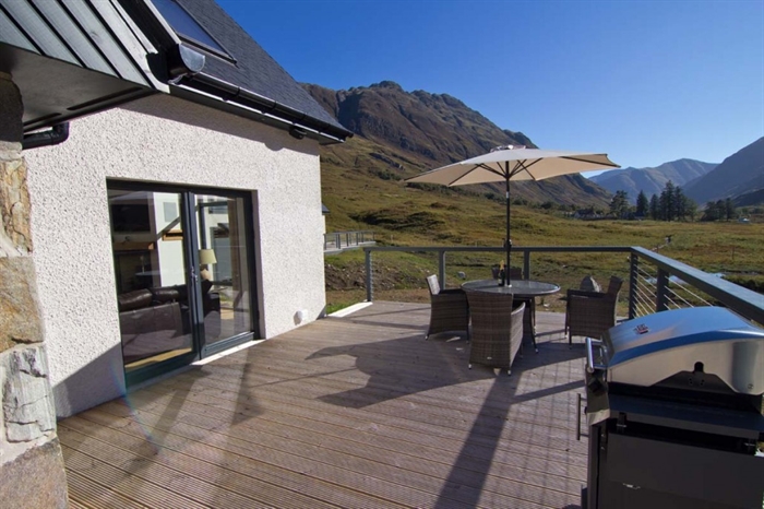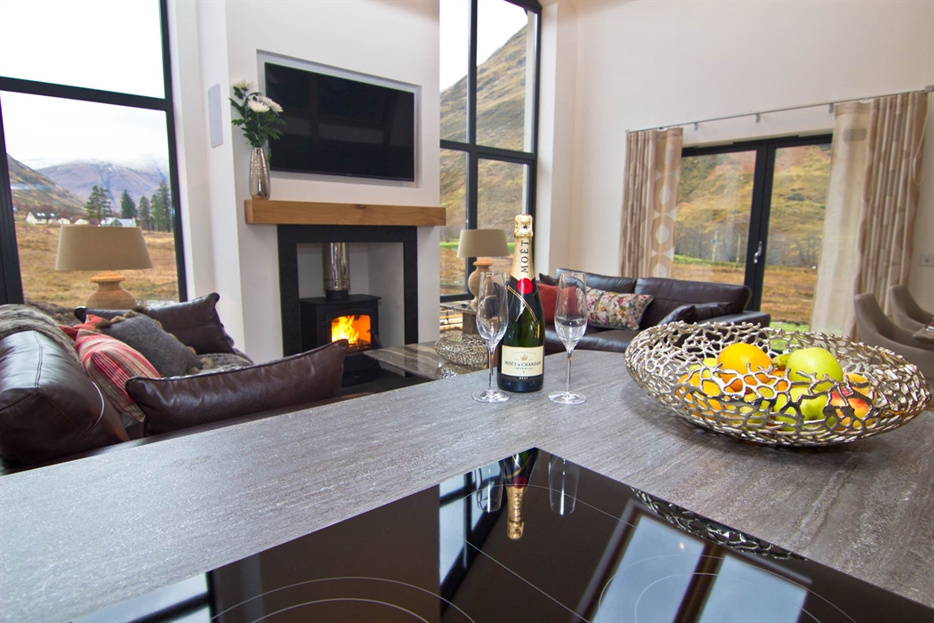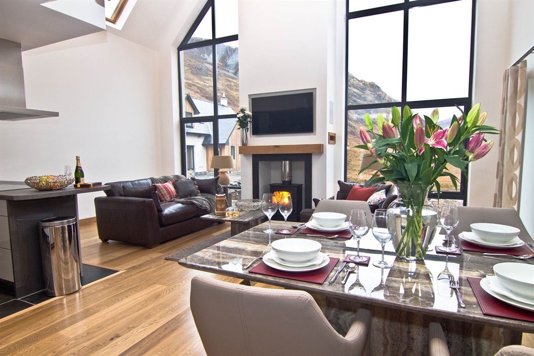 Lounge with vaulted ceiling, log burning stove, large flat screen TV, full height glazed gable giving spectacular views of the mountains, French doors leading to decking and BBQ area.