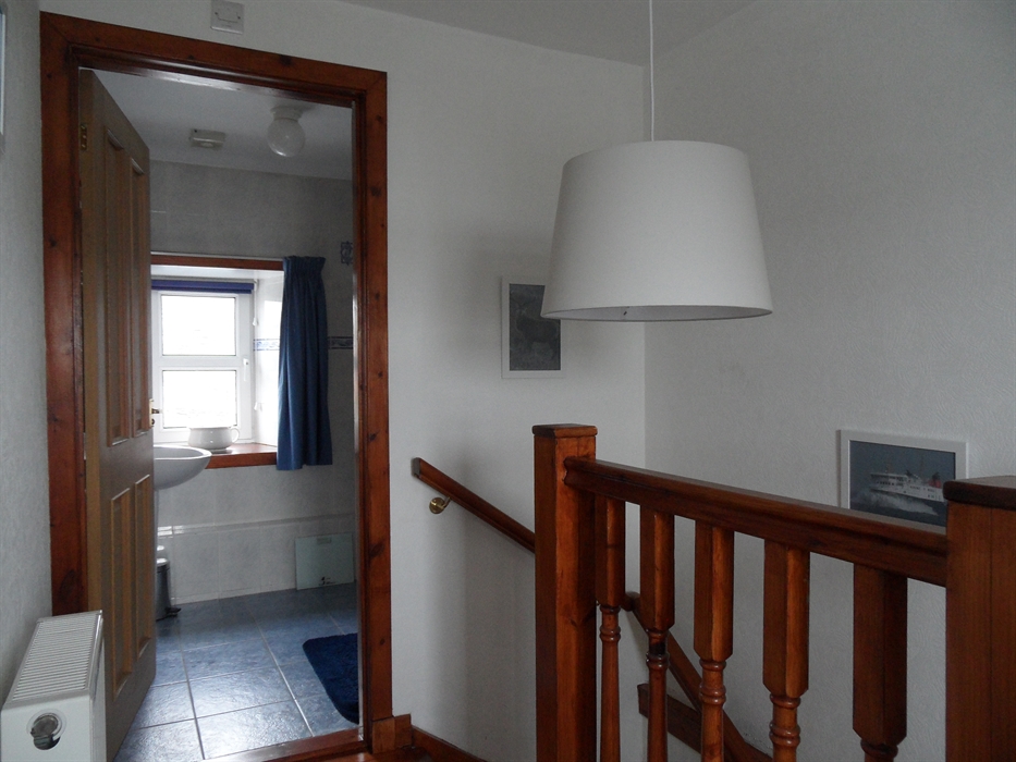 Front lobby leading to the open plan linked lounge & dining areas with wall mounted OS map of Islay and a fully fitted modern kitchen, twin bedroom and bathroom. The back door to the kitchen opens onto the private walled garden.