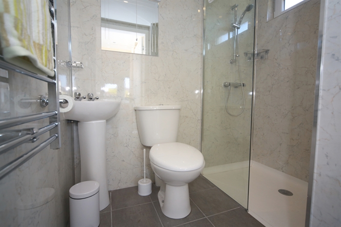 From the sun room you enter a small hallway which has a full sized walk in shower and toilet off to one side.