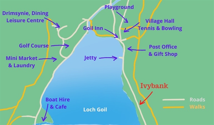 It is a pleasant 10 minute stroll down Inverlounin Road into the village where you will find the post office and general good store and the Goil Inn which is the village pub and restaurant. Either a 30 minute walk through the village, or around the lochside; or a 5 minute drive on quiet roads, you will find more dining and activities available at the Drimsynie Estate. For a small lochside village there truly is an impressive choice of places to go and things to do.
