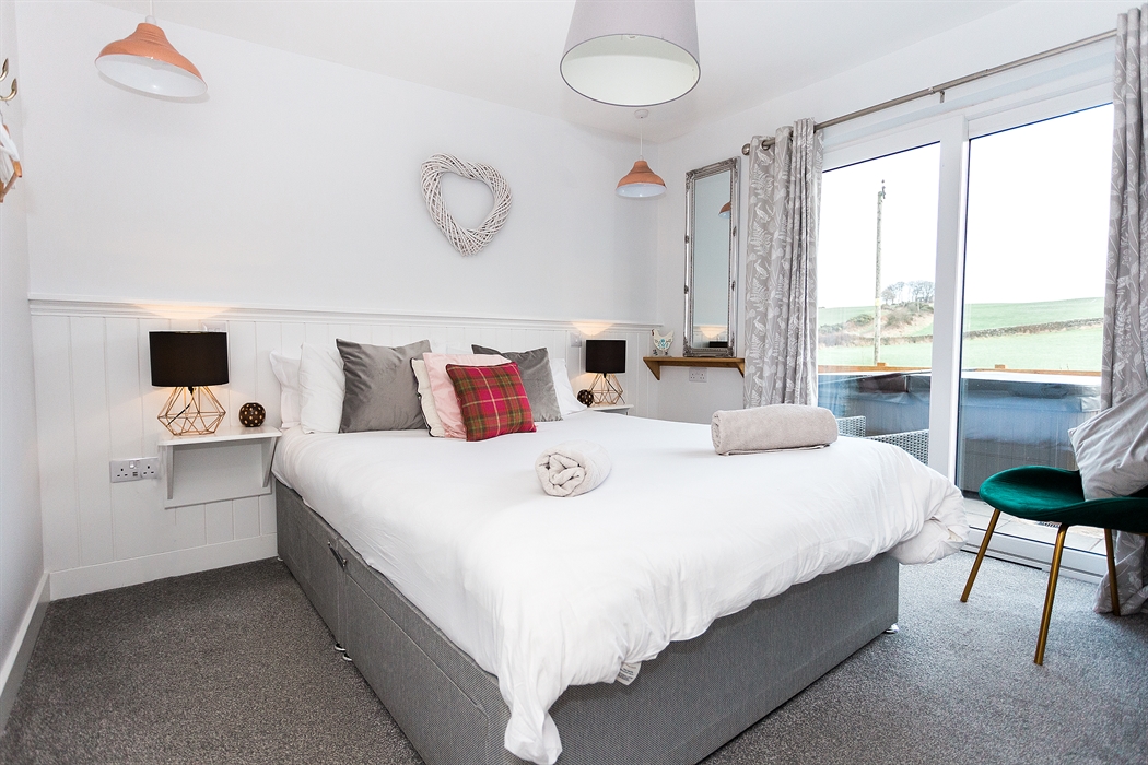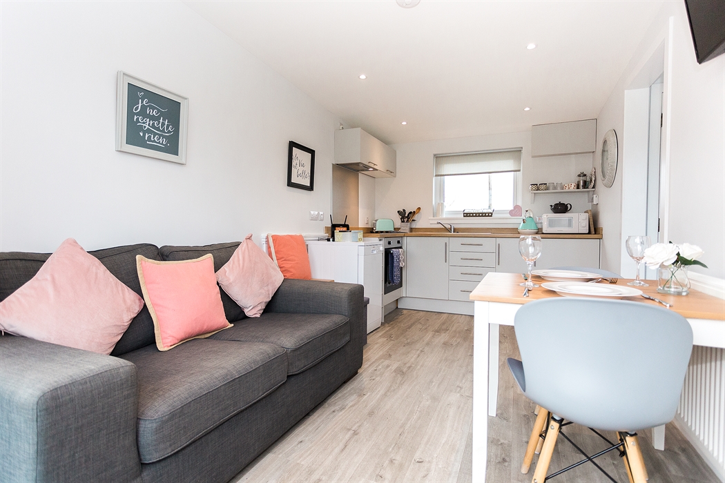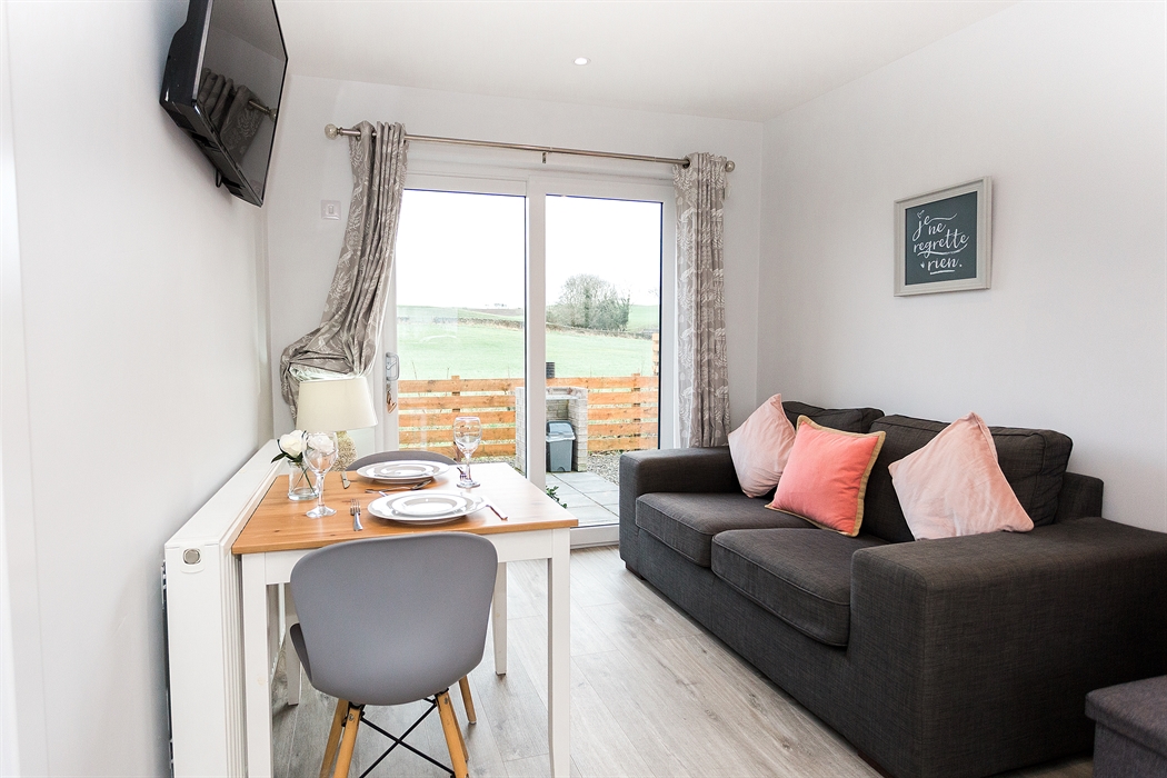Accommodation for 2 all on one level: Open plan Kitchen Living/Dining room with with patio doors leading to patio with Hot Tub; Master bedroom with King size bed; Shower Room with walk in shower, toilet and wash basin.