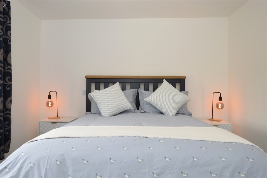 Bedroom 2: Double bed, bedside tables, dresser.