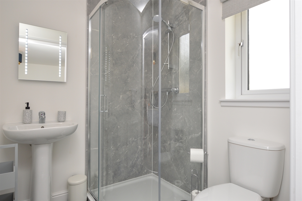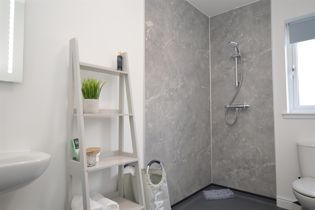 Family bathroom: Walk-in shower wet room, toilet and hand basin