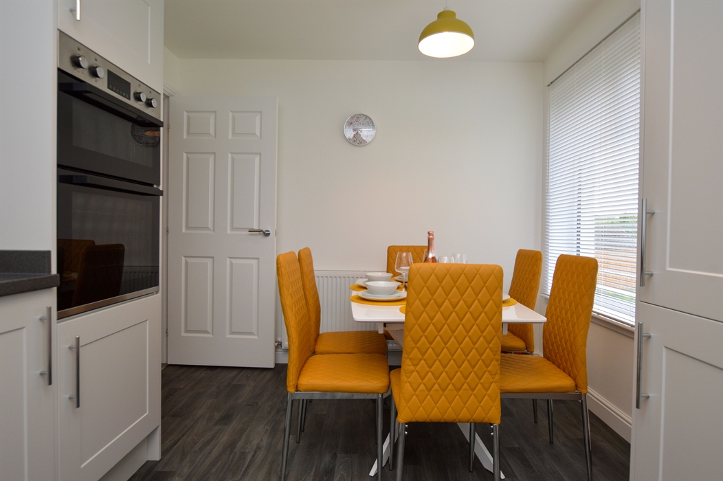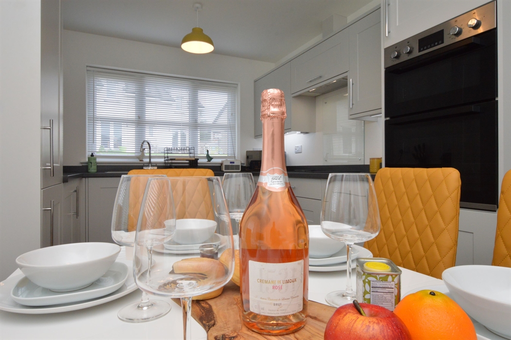 Kitchen: With electric oven, electric hob, dishwasher, microwave, fridge/freezer and dining table.